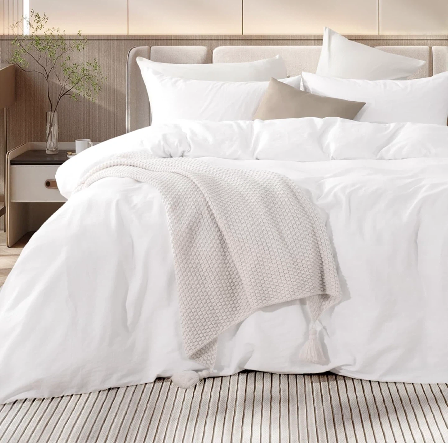 Selling a white king comforter set. It's in brand new condition and would look lovely in any bedroom. The material is soft and comfortable, perfect for a good night's sleep! It's a simple way to refresh your bedding