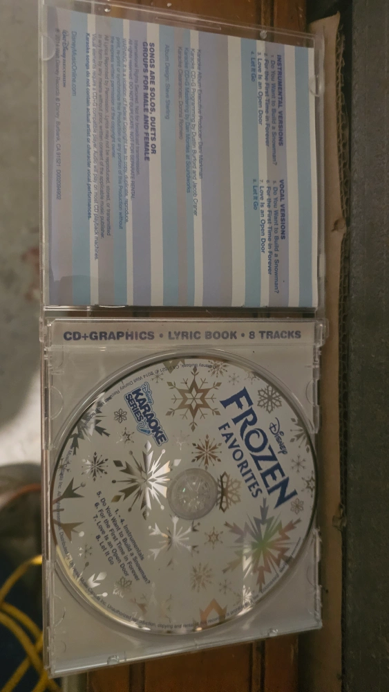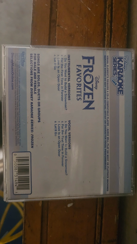 Selling a Disney Frozen Favorites Karaoke Series CD! It includes both instrumental and vocal versions of songs like 'Do You Want to Build a Snowman?' and 'Let It Go'. Perfect for karaoke fun!
