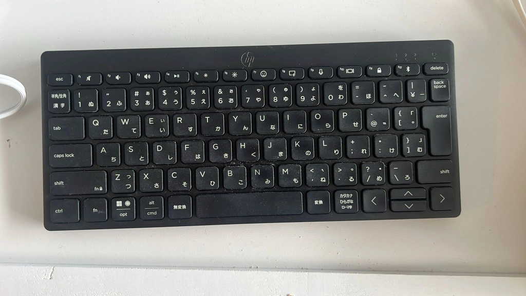 Selling a black HP wireless keyboard. It features function keys, a number row, and various special characters specific to the Japanese layout. It's in good condition and ready to use! Perfect for your computer or tablet setup.