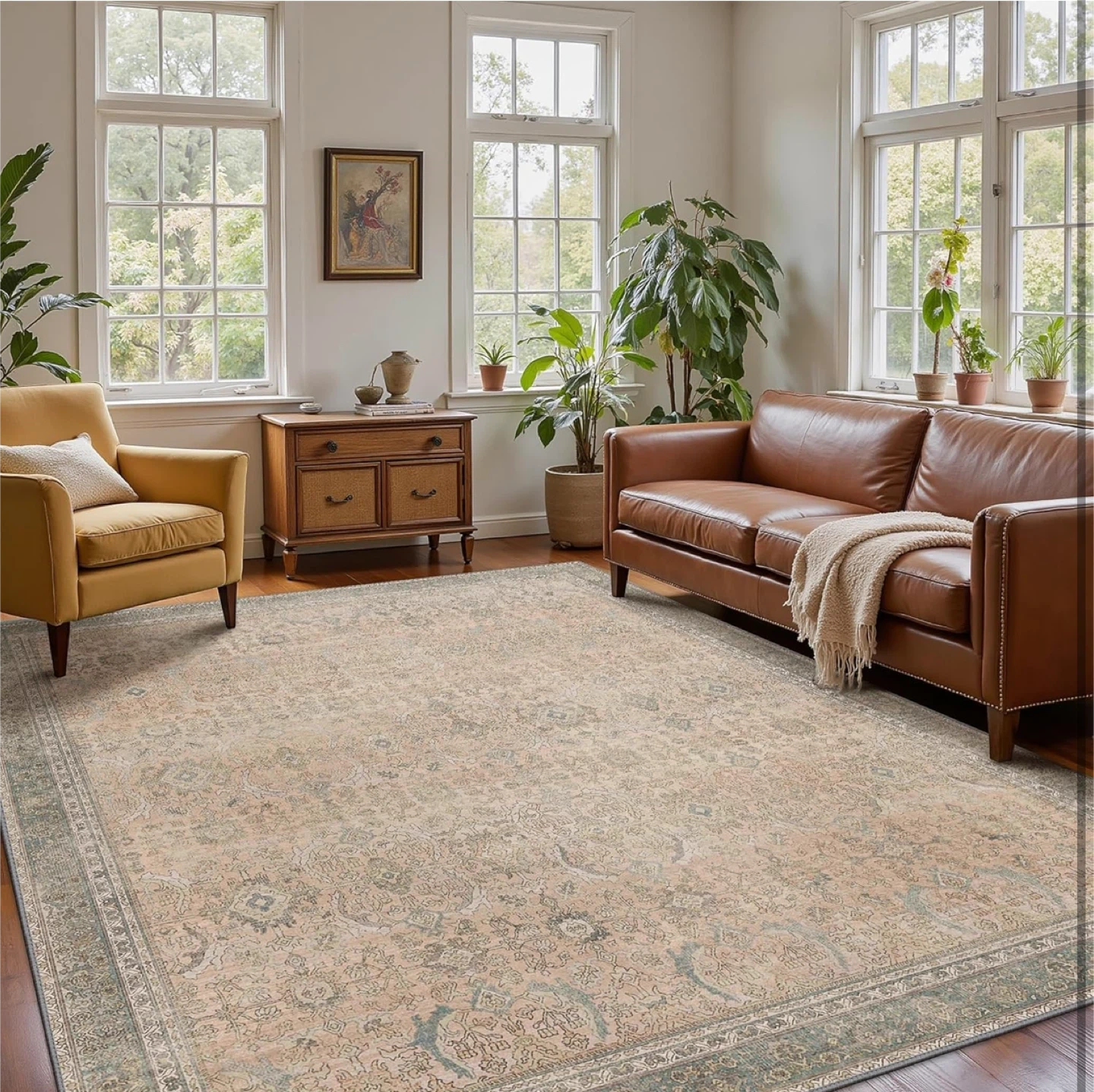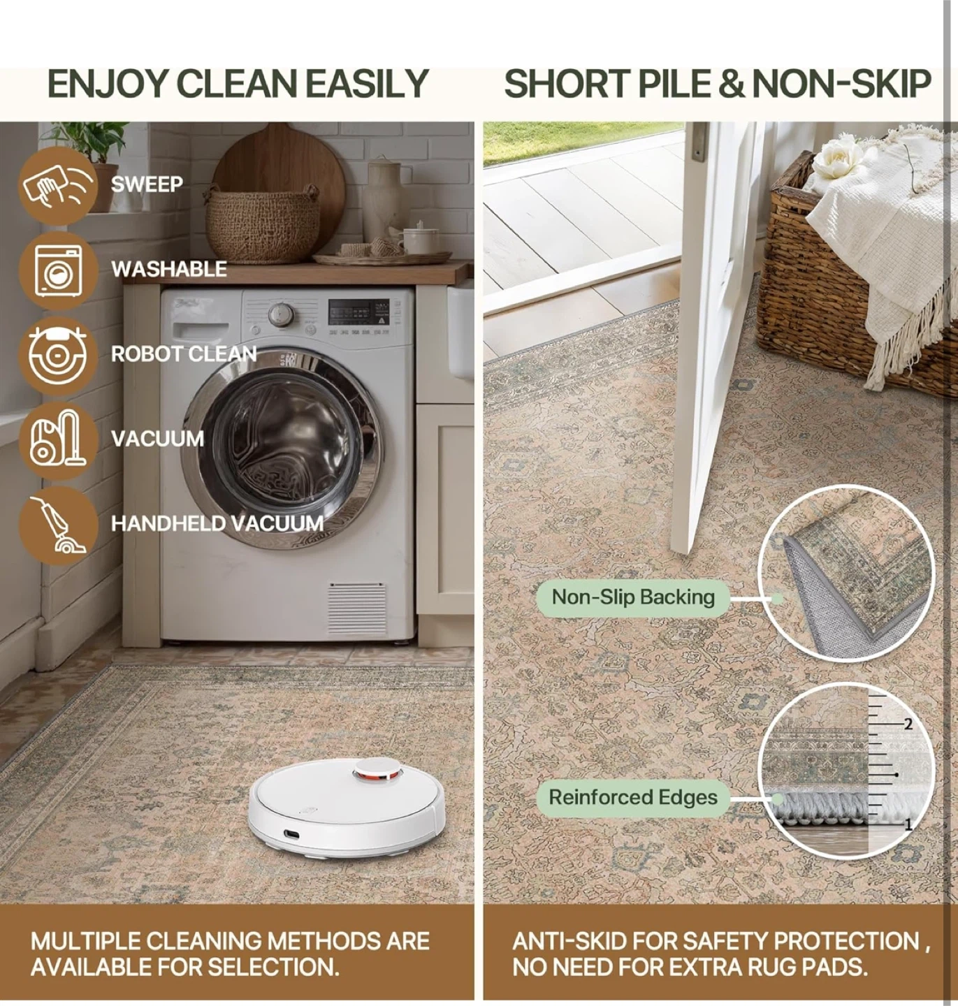 Looking to add some style and comfort to your home? This area rug is perfect! It's designed with: - Non-slip backing for safety - Reinforced edges for durability - Easy to clean – sweep, wash, robot clean, vacuum, or handheld vacuum It’s also anti-skid, so no need for extra rug pads