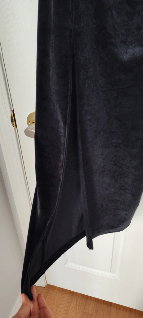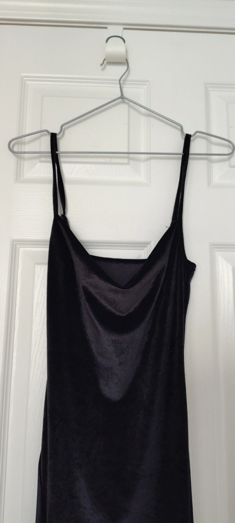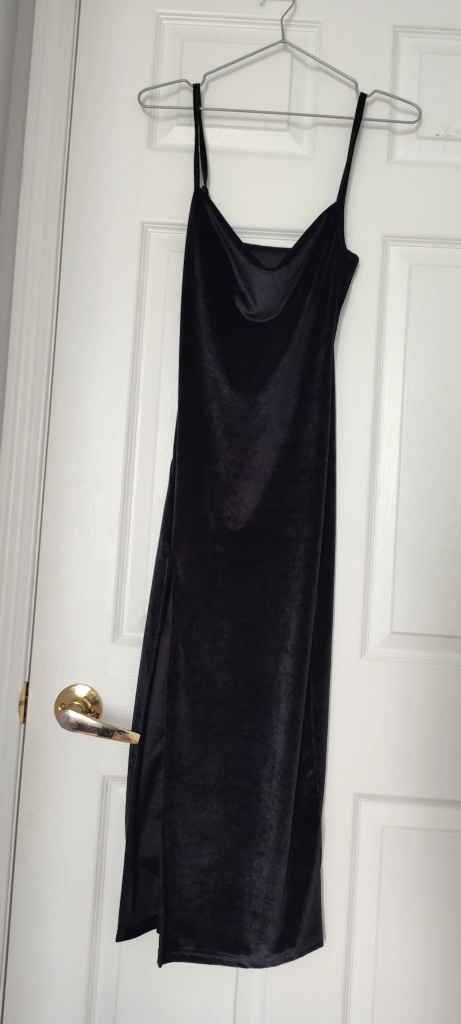 Selling a stylish black velvet dress! It's in great condition and features a sleek design with a side slit. Perfect for a night out or a special occasion!