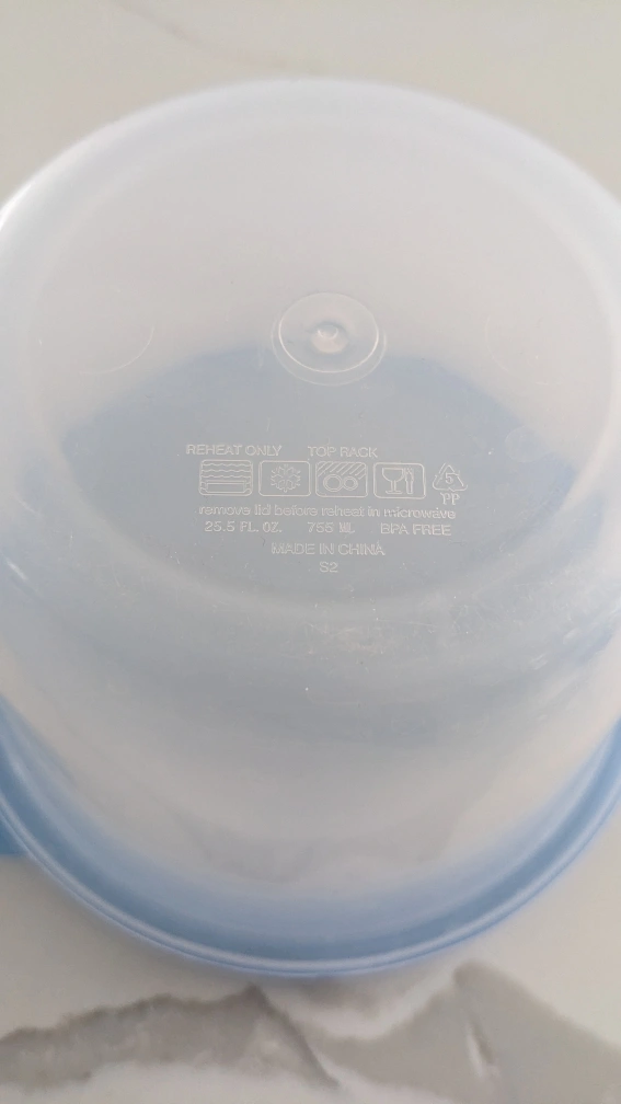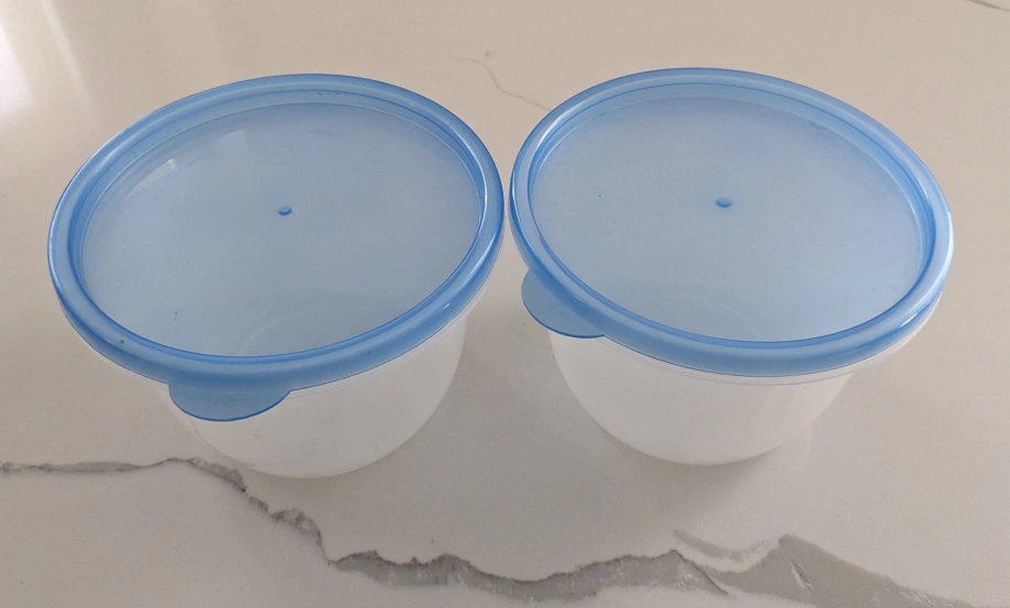 Two plastic food containers with blue lids for sale! They are BPA free and top rack dishwasher safe. Each container holds 23.5 fl oz or 750 mL. Perfect for storing leftovers or packing lunches.