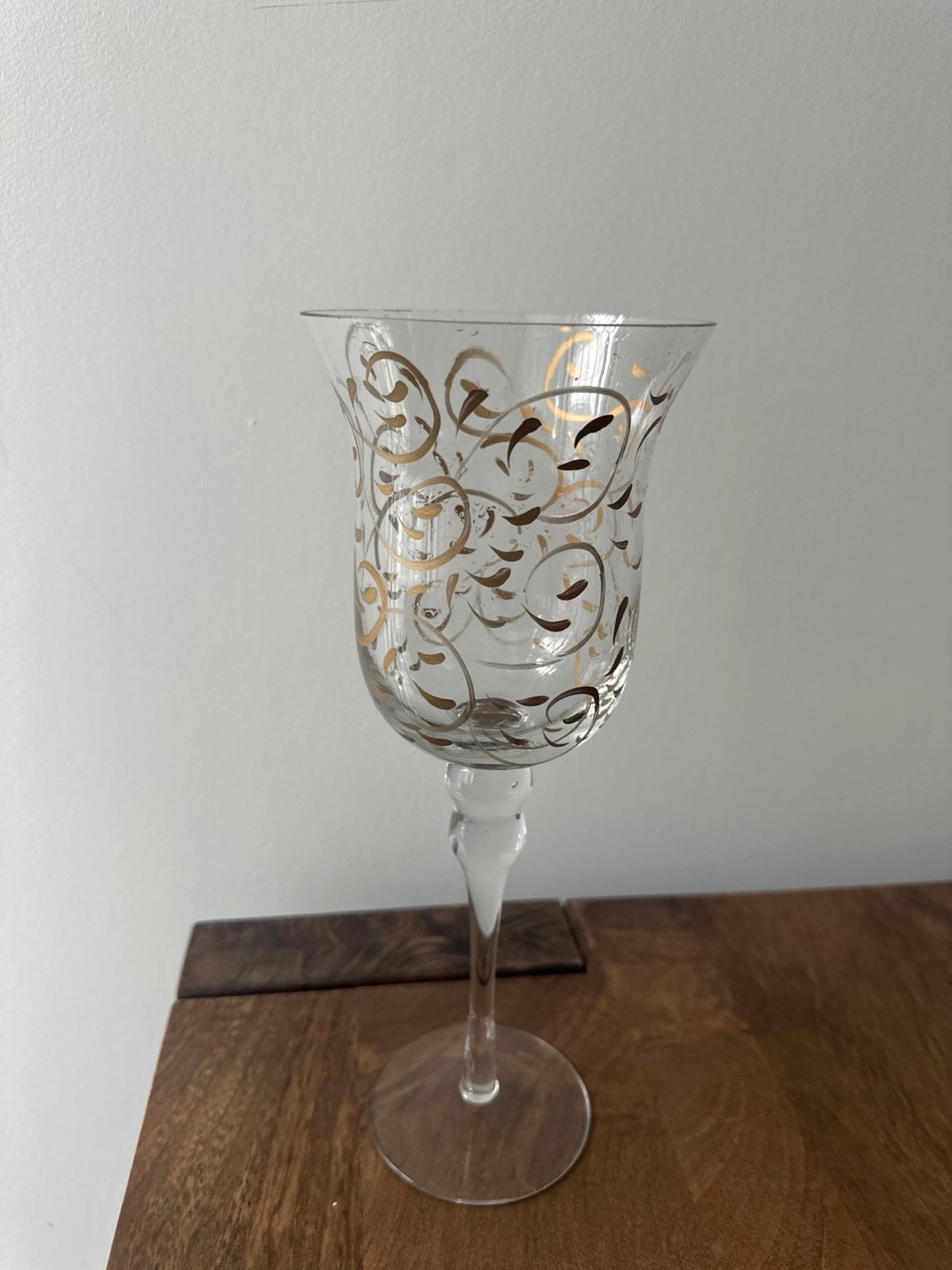 This is a beautiful glass vase with delicate gold swirl accents. It stands approximately 12 inches tall, making it a lovely centrepiece or decorative item for your home. It's in great condition and ready to add a touch of elegance to any room!