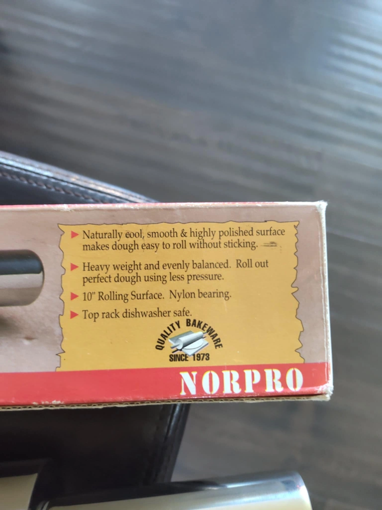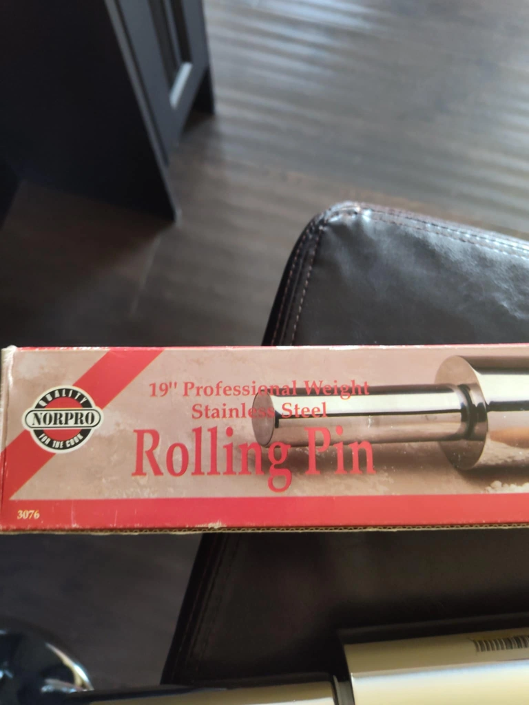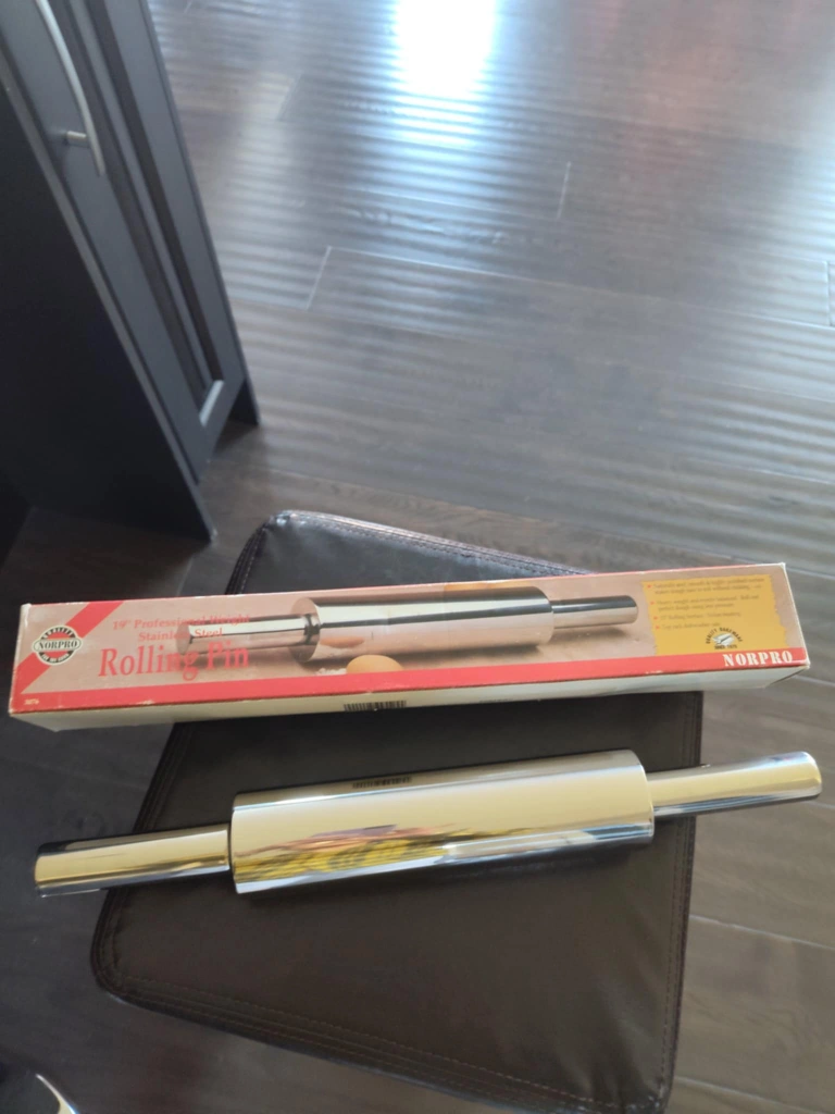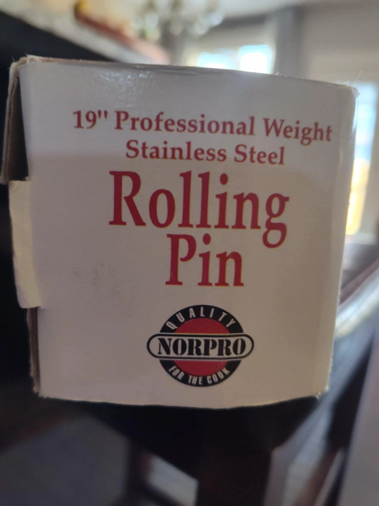 Selling a Norpro 19" professional weight stainless steel rolling pin. It's heavy weight and evenly balanced, so you can roll out perfect dough using less pressure. The surface is naturally cool, smooth, and highly polished, making dough easy to roll without sticking. It also has a 10" rolling surface with a nylon bearing. The box is included!
