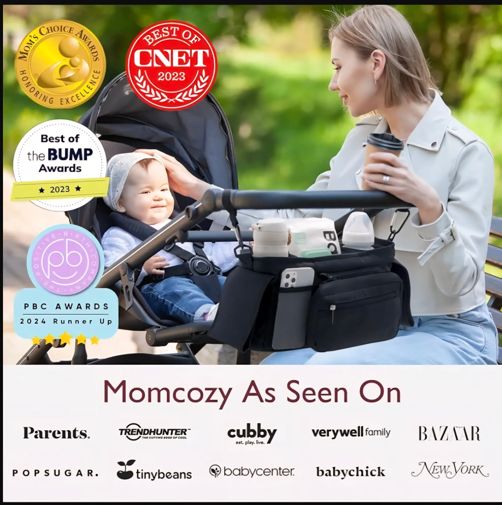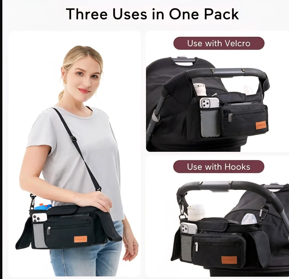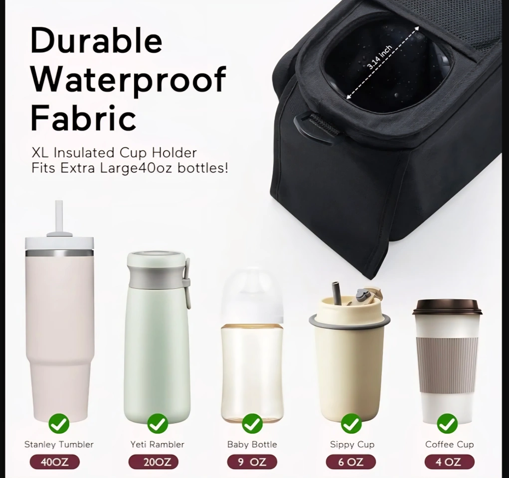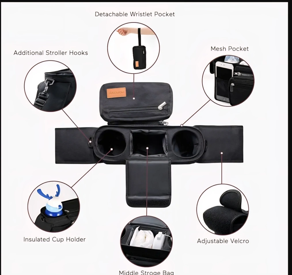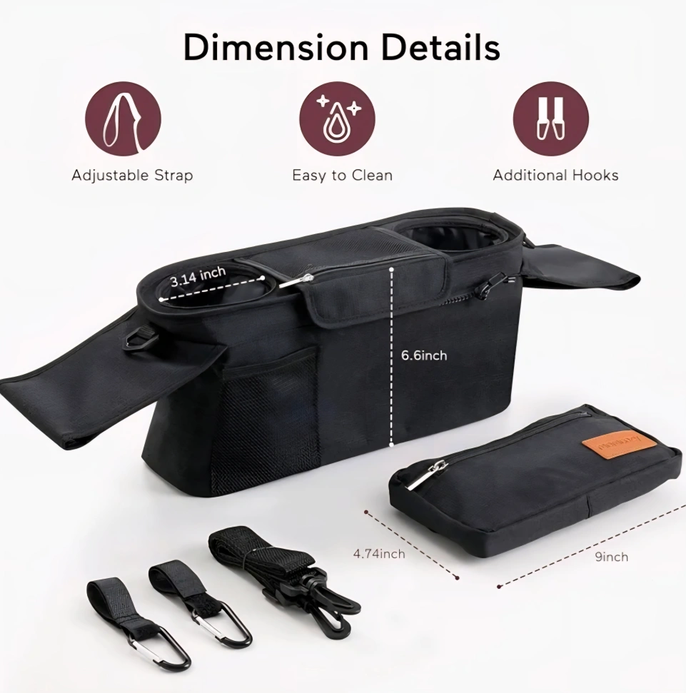 Keep all your essentials organized with this Momcozy stroller organizer bag! It's black and features: - Durable waterproof fabric - XL insulated cup holders (fits extra large 40oz bottles!) - Three uses in one pack: use with velcro or hooks - Adjustable strap - Easy to clean - Additional hooks - Detachable wristlet pocket - Mesh pocket - Middle storage bag - Adjustable velcro Dimensions: - 3.14 inch cup holder diameter - 6.6 inch height - 4.74 inch wristlet pocket height - 9 inch wristlet pocket length