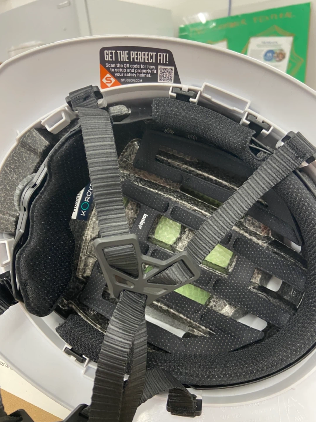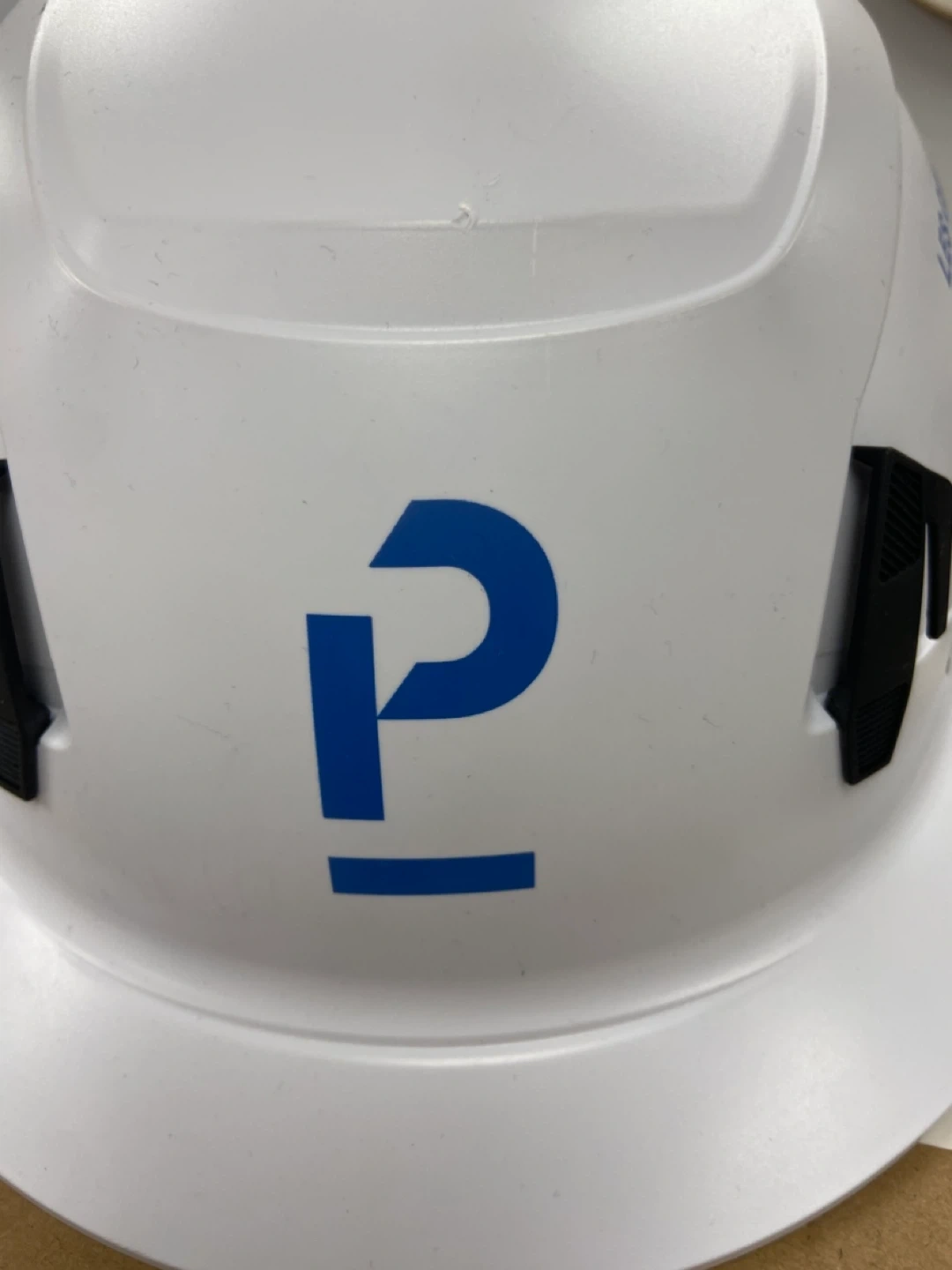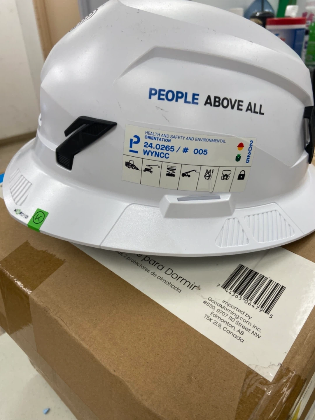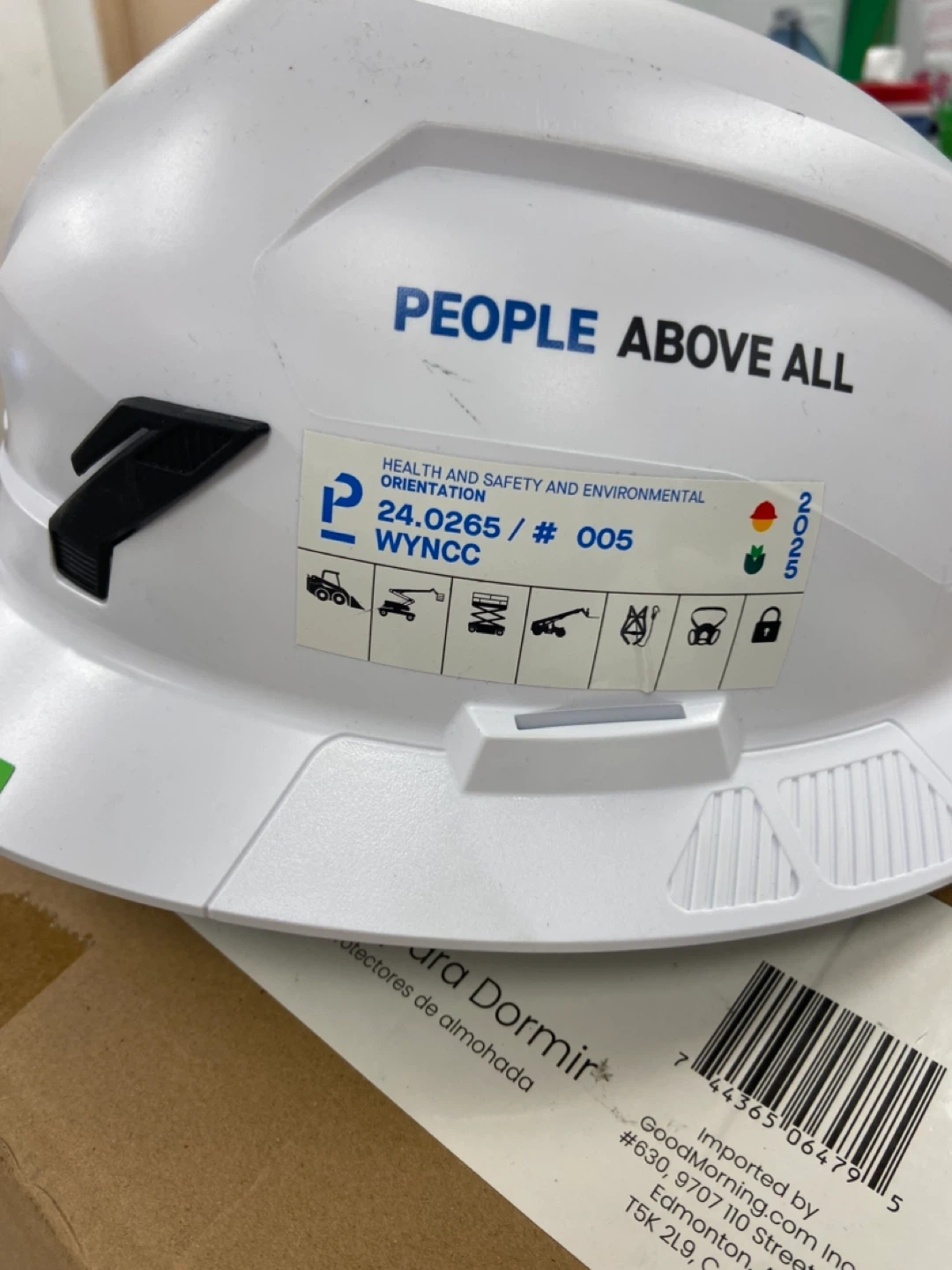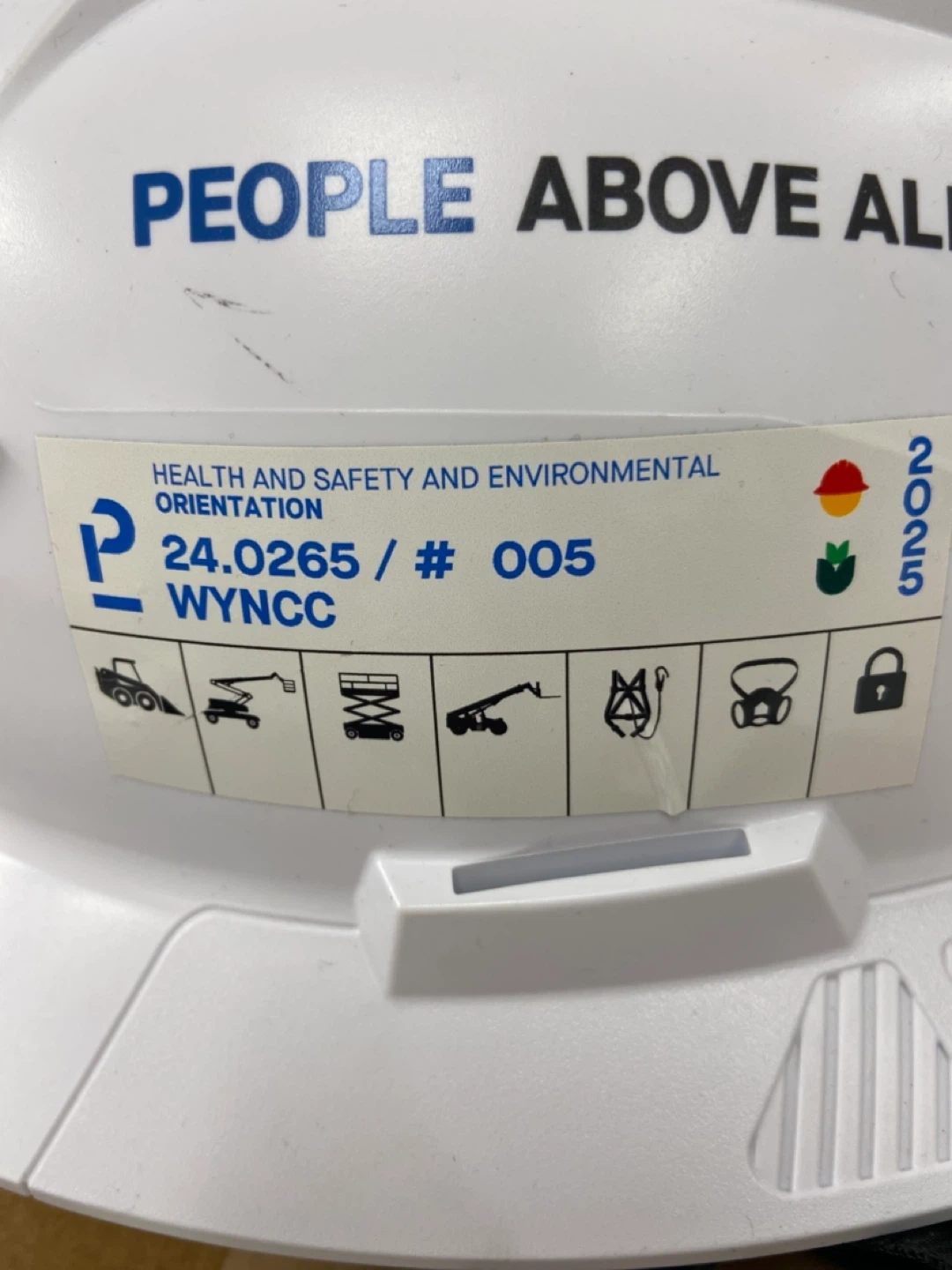 Selling a white hard hat with "PEOPLE ABOVE ALL" printed on it. It also has a health and safety orientation sticker. The sticker says 2025, so I'm assuming that's the expiry date, December 2025.