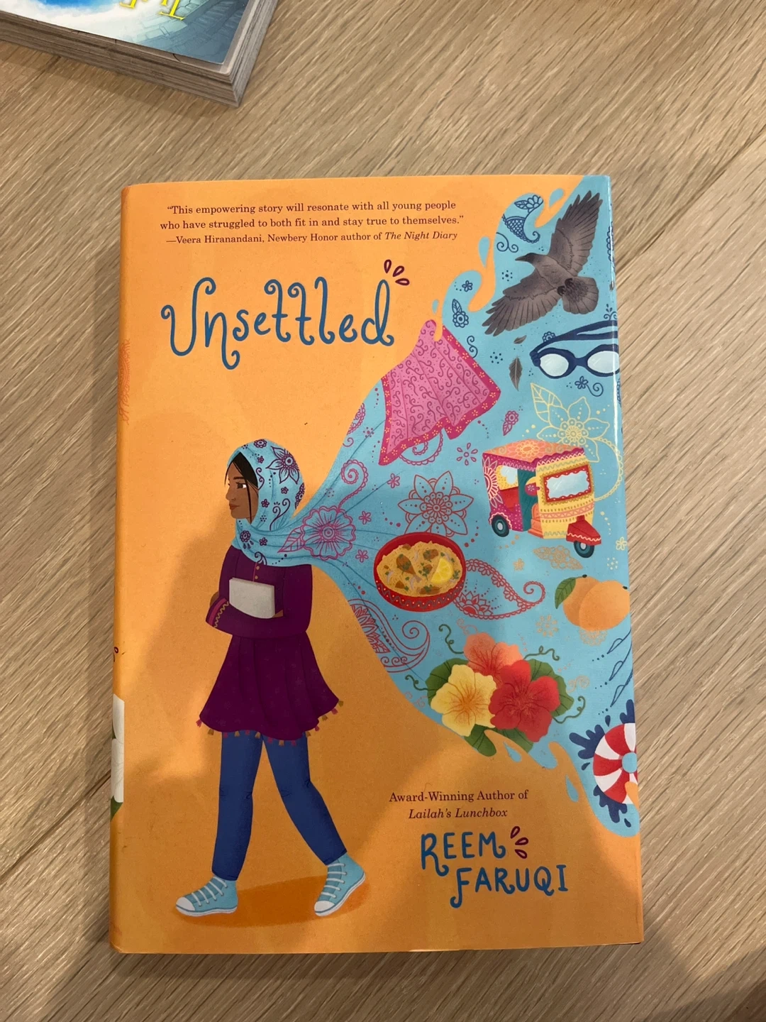 Selling the book Unsettled by Reem Faruqi. It's a story about finding your place and staying true to yourself. The cover is bright and colourful, and the book is in great condition. A great read for young people!