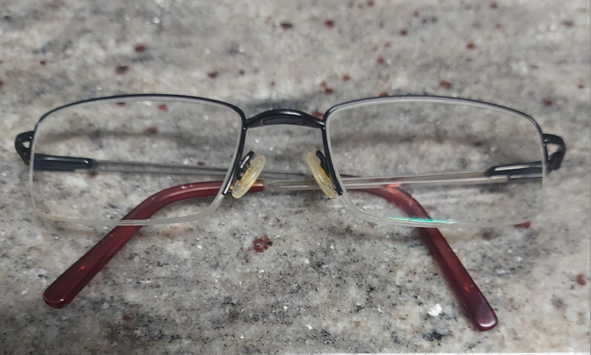 Selling a pair of eyeglasses with black and red frames. They show some signs of use, but are otherwise in good condition and ready for a new home