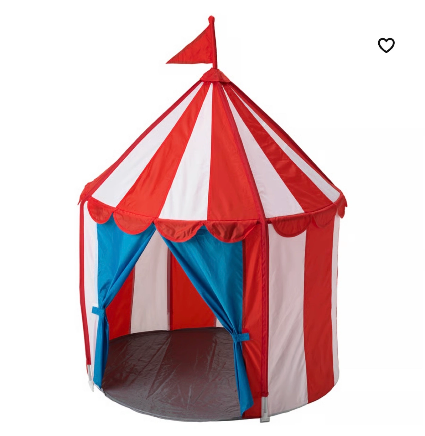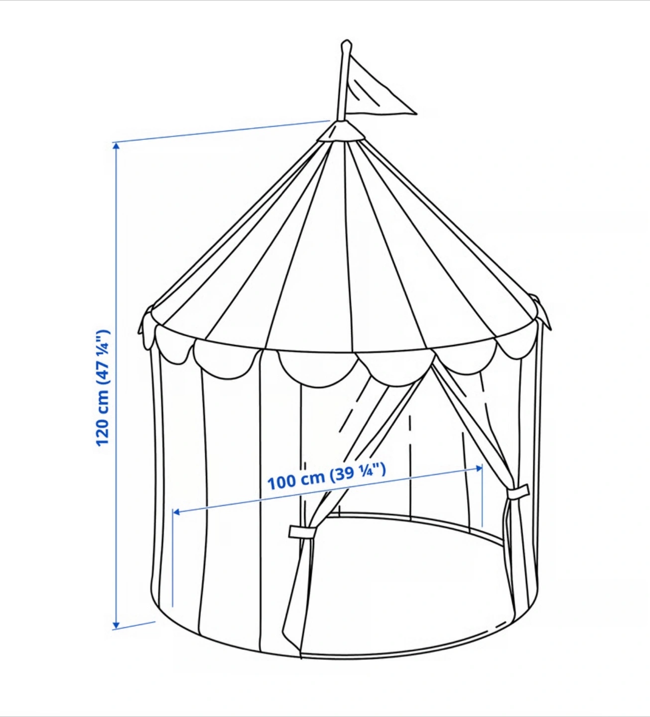 I'm selling an IKEA BUSA circus tent. It's in great condition and ready for a new home! It's easy to assemble and disassemble, making it great for storage. The tent is red and white striped with blue accents. Dimensions are 120 cm (47 1/4") in height and 100 cm (39 1/4") in diameter.
