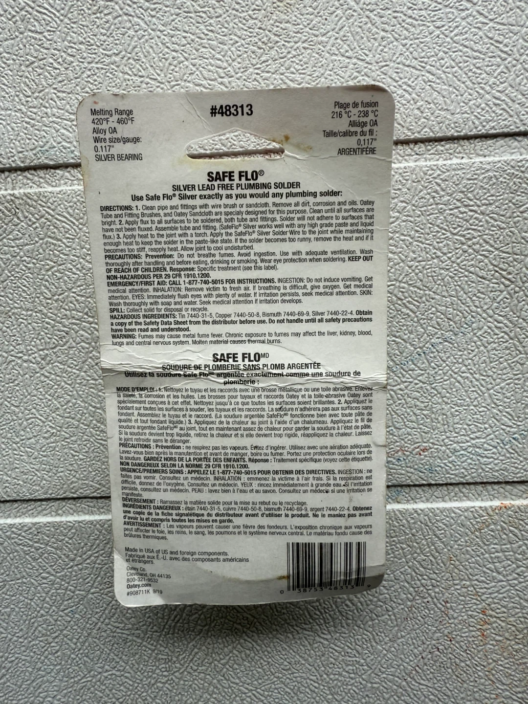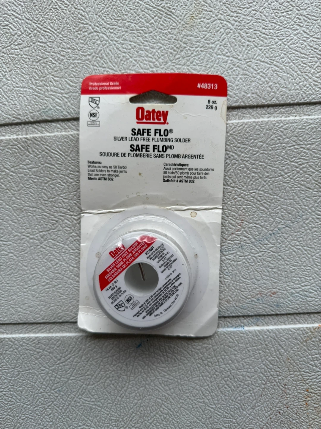 I'm selling Oatey Safe Flo silver lead-free plumbing solder. It's professional grade and weighs 8 oz (226 g). This solder is designed to make joints that are even stronger and meets ASTM B32