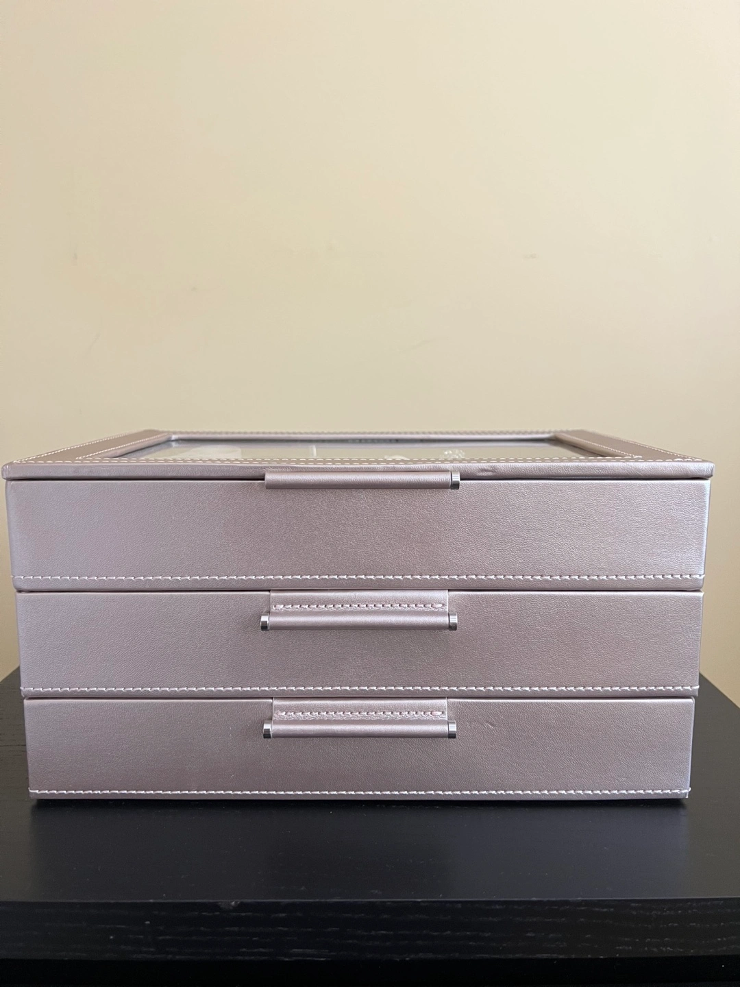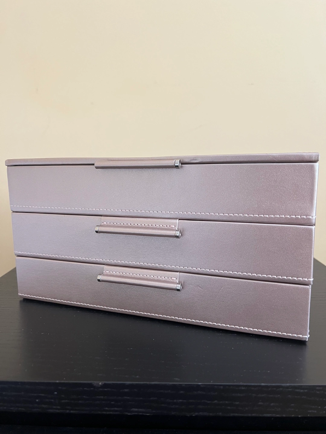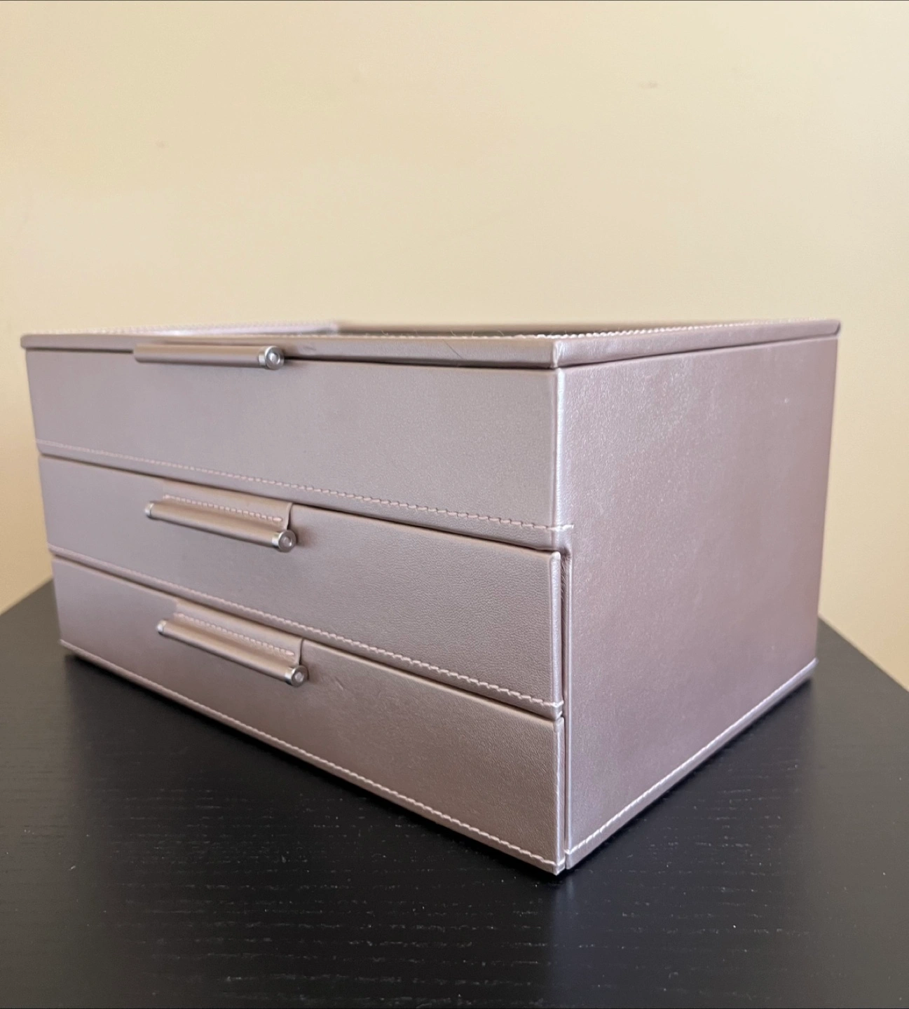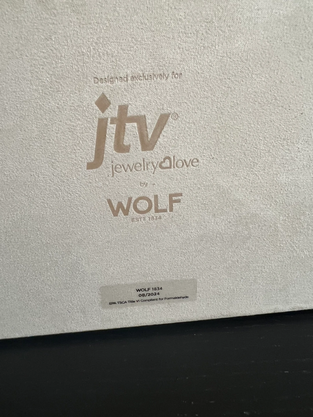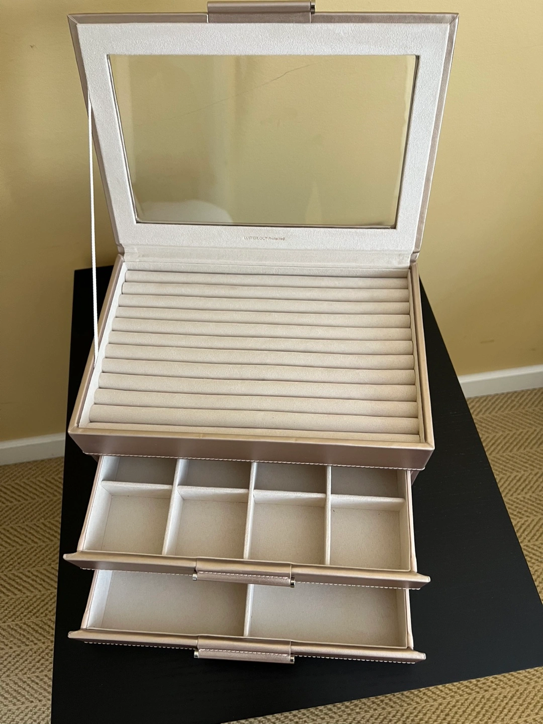 WOLF, a company specializing in jewelry boxes since 1834 Featuring classic yet contemporary design, focusing on protecting jewelry with style and function Metallic Faux Leather A lift lid with window and two pull out trays all with WOLF's exclusive LusterLoc anti-tarnish lining to keep jewelry looking its best!! Top compartment contains 12 ring rolls that can fit up to 121 rings or earrings, middle drawer contains 12 compartments each measuring appx. 2.25" x 2" and bottom drawer contains 4 compartments measuring appx. 4.75" x 3" each Entire box measures approximately 10.5"L x 7"W x 5.5"H Jewelry box for you to cherish and protect your jewelry for years to come!!! Great clean condition Smoke free home **Jewerly is not included ** Asking $45 Interested? Message me and please check my other listings…