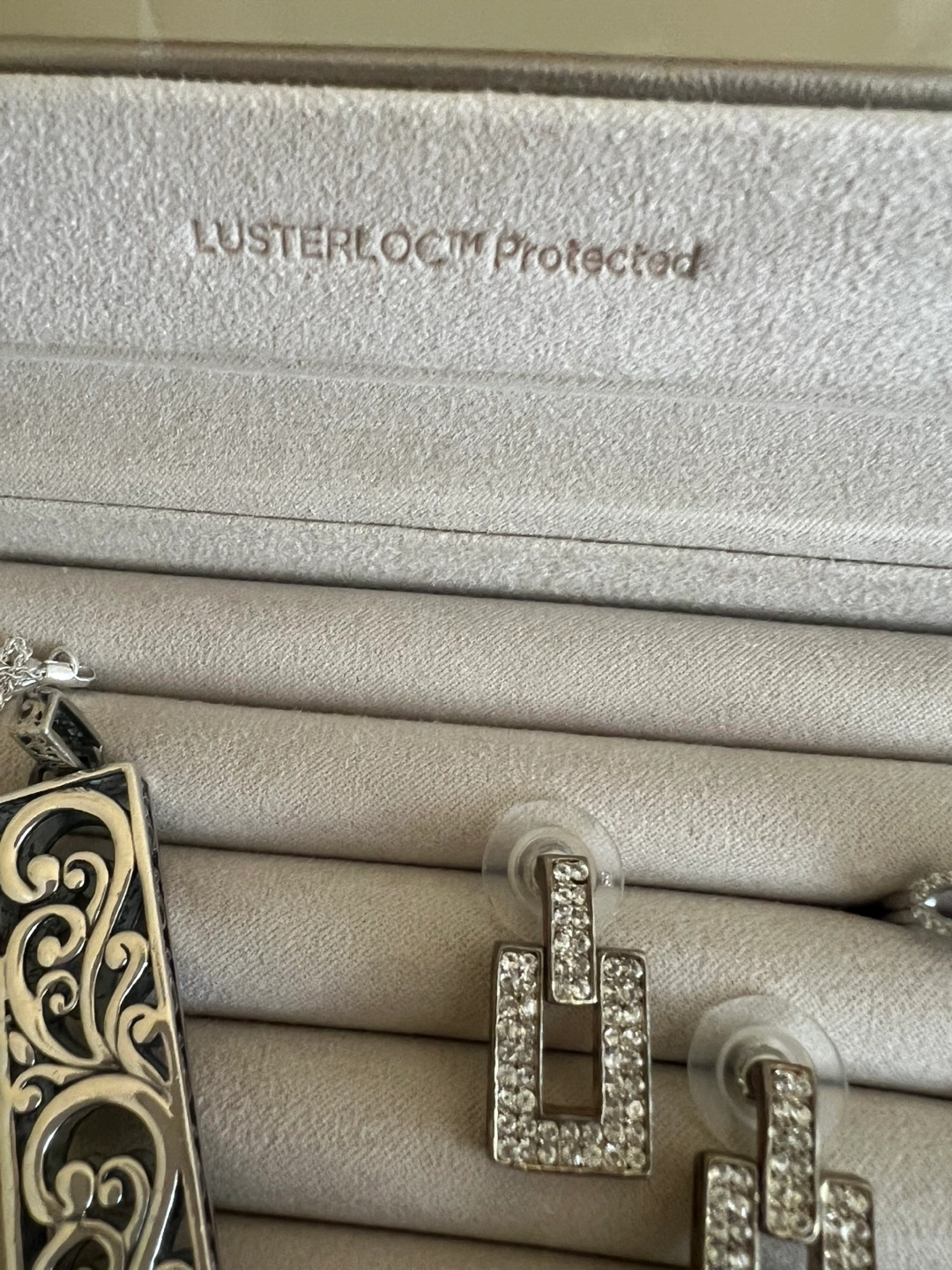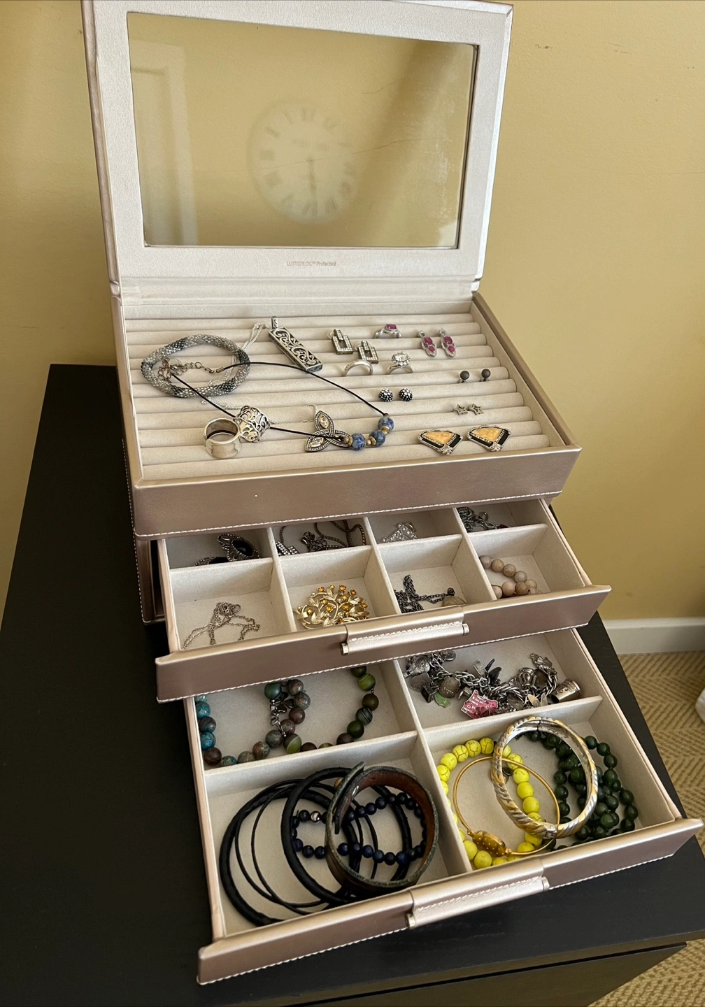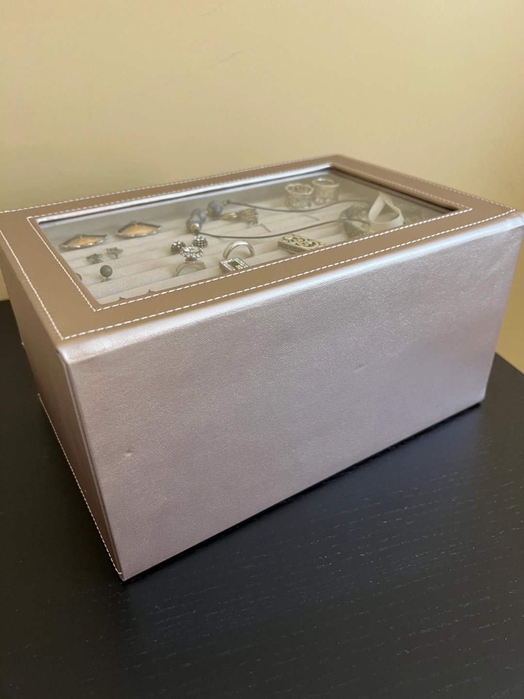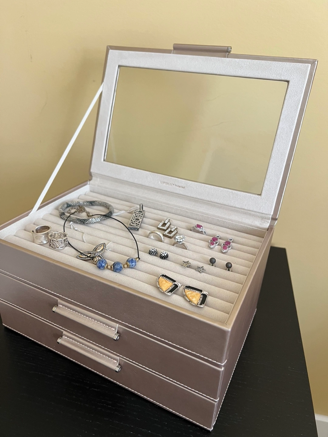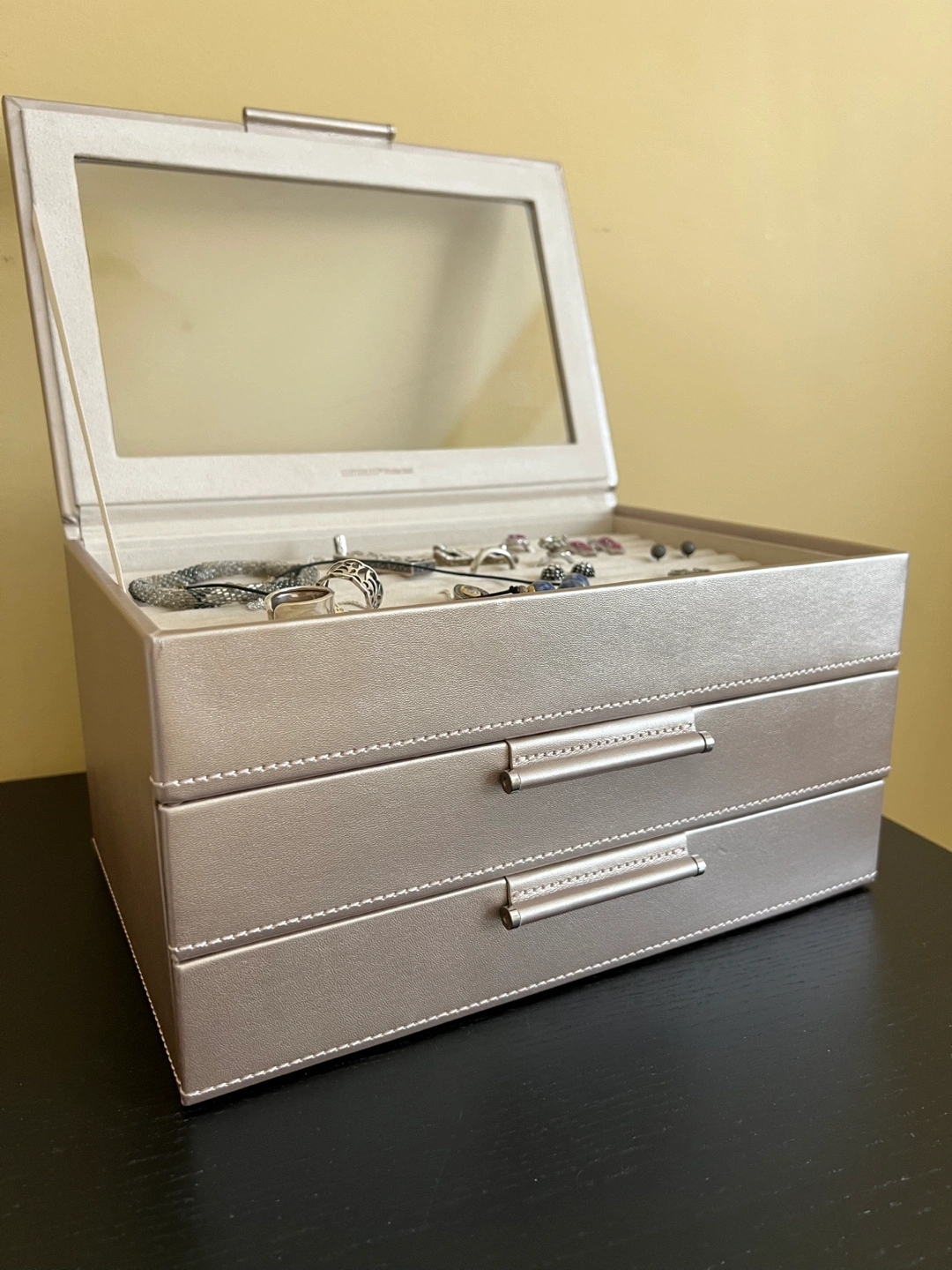 WOLF, a company specializing in jewelry boxes since 1834 Featuring classic yet contemporary design, focusing on protecting jewelry with style and function Metallic Faux Leather A lift lid with window and two pull out trays all with WOLF's exclusive LusterLoc anti-tarnish lining to keep jewelry looking its best!! Top compartment contains 12 ring rolls that can fit up to 121 rings or earrings, middle drawer contains 12 compartments each measuring appx. 2.25" x 2" and bottom drawer contains 4 compartments measuring appx. 4.75" x 3" each Entire box measures approximately 10.5"L x 7"W x 5.5"H Jewelry box for you to cherish and protect your jewelry for years to come!!! Great clean condition Smoke free home **Jewerly is not included ** Asking $45 Interested? Message me and please check my other listings…