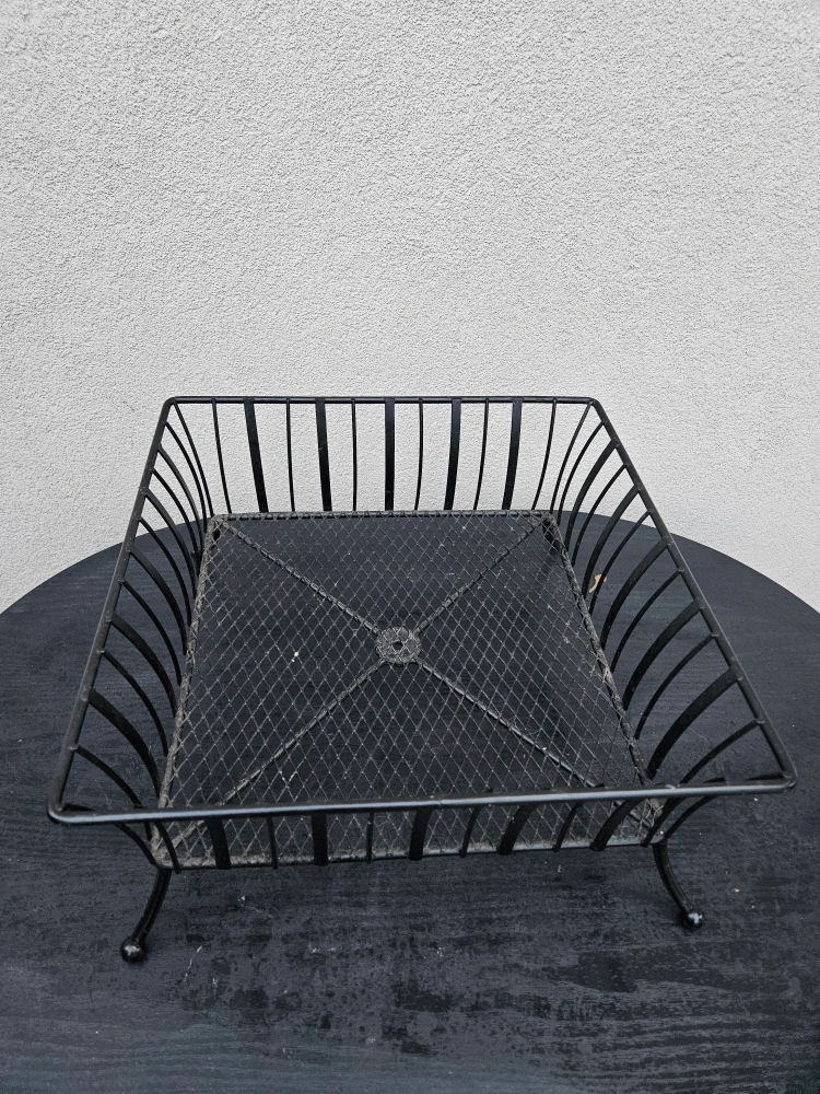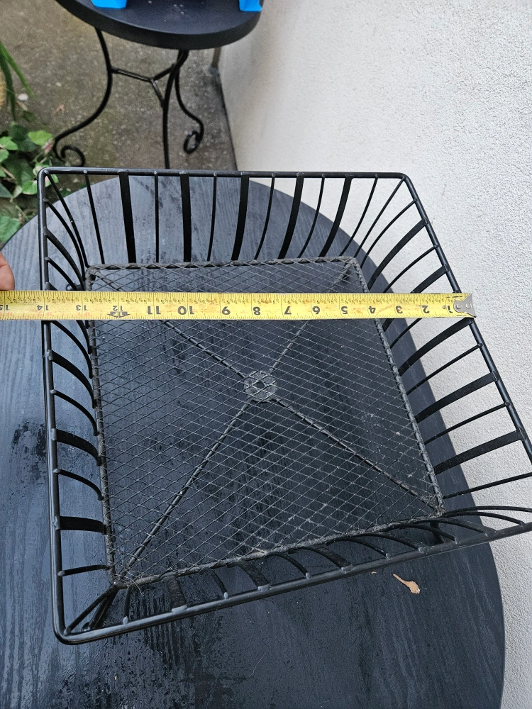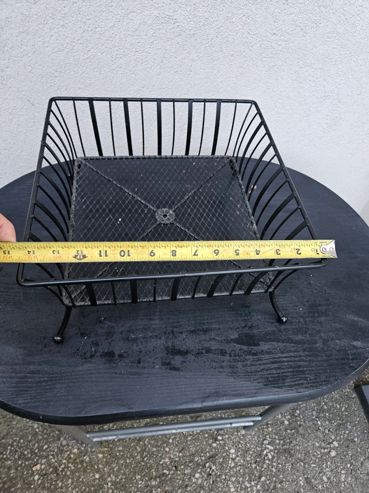 Selling a black metal wire basket, perfect for storage or display! It's in great shape and measures approximately 15 inches across. It would be a nice addition to any room!