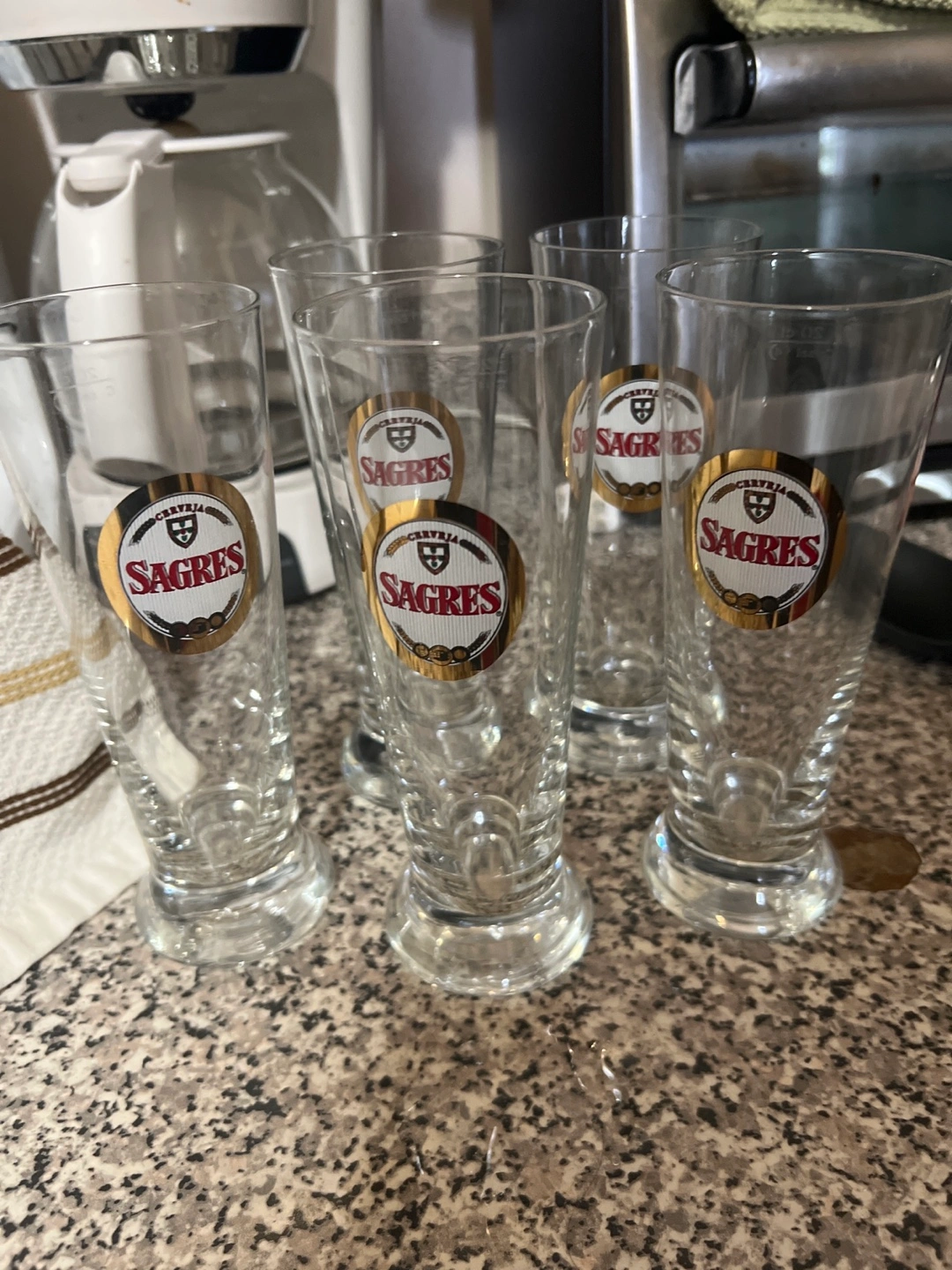 Selling a set of five Sagres beer glasses. Perfect for enjoying your favourite brew! They are in great condition and ready for a new home.