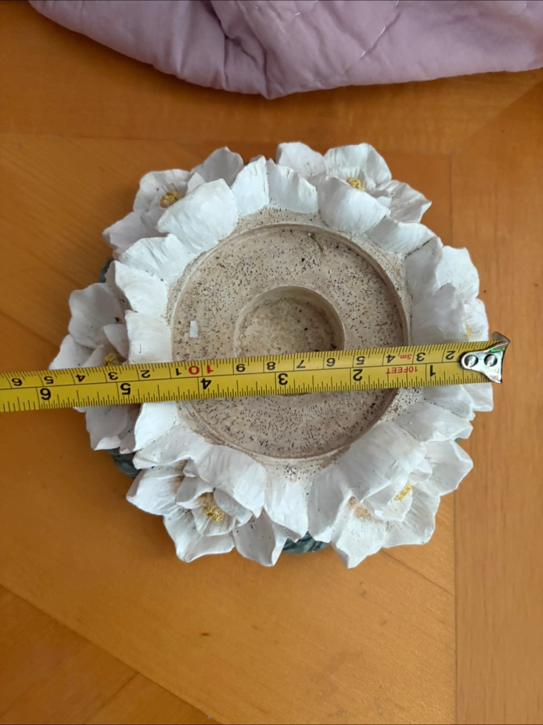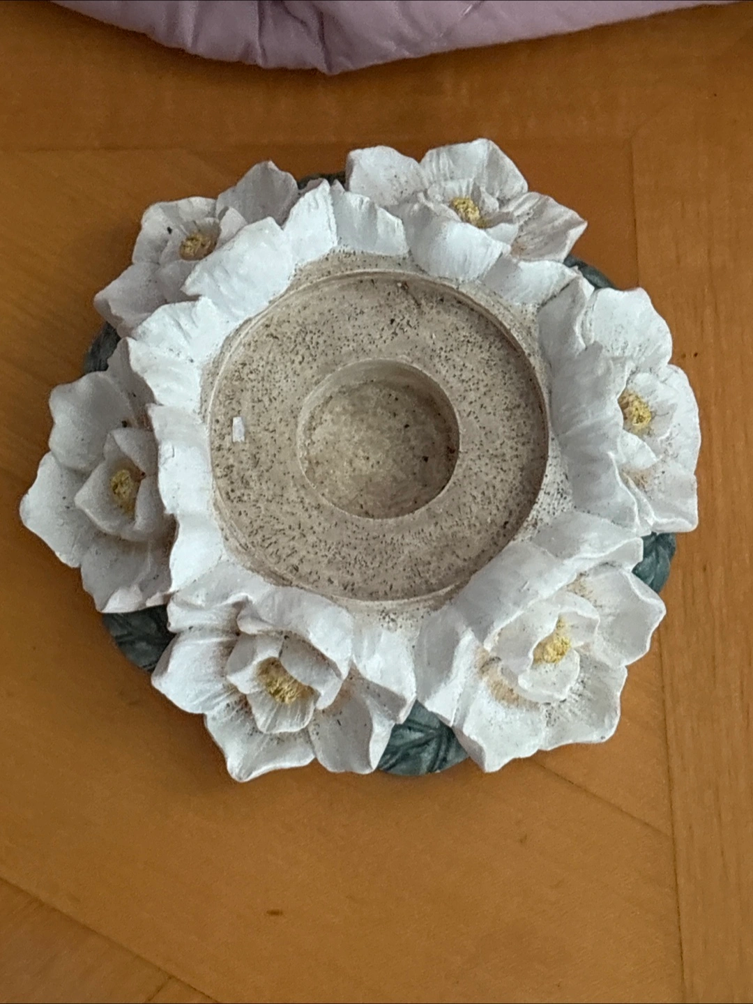 A lovely floral candle holder! It measures approximately 4 inches in diameter. Perfect for adding a touch of elegance to any room Only available for pick up.