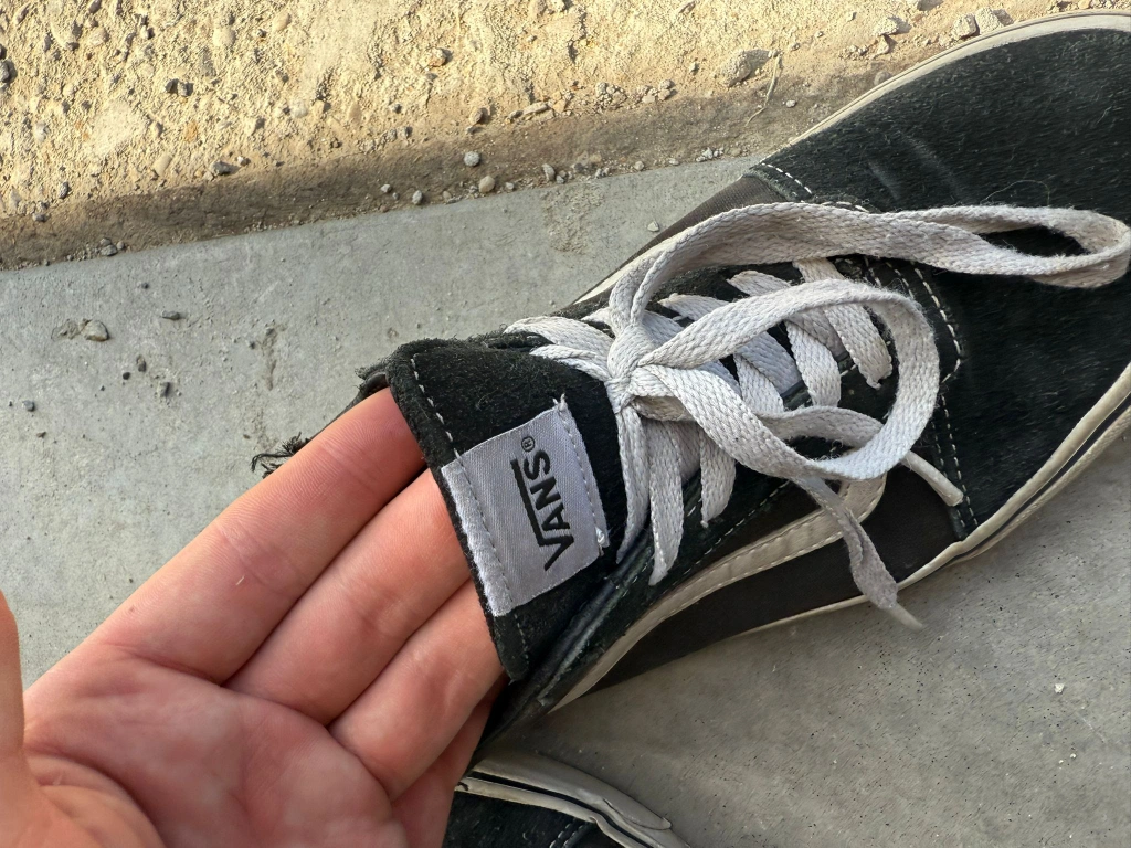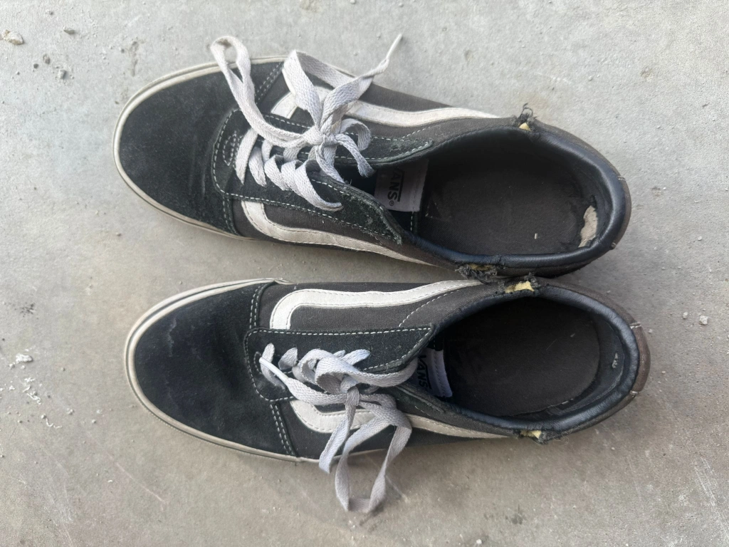Selling a pair of Vans Old Skool sneakers in black and white. They are a size 8. Please note that there are signs of wear and tear, as shown in the photos, but they still have lots of life left!