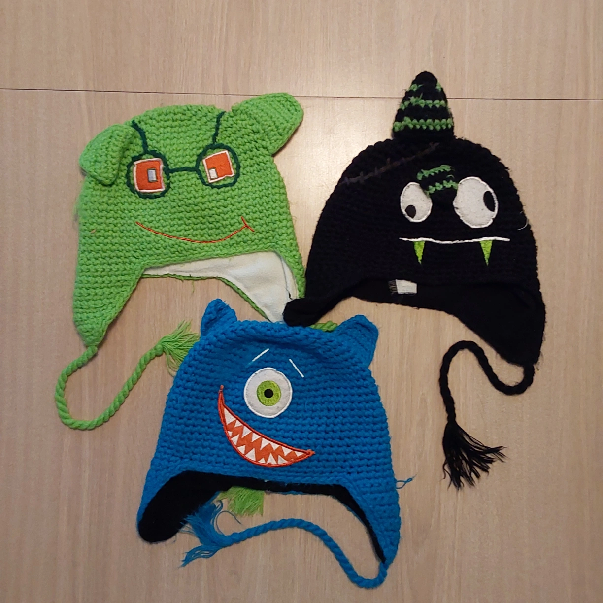 Here's a set of three adorable monster knit hats! Each hat features a unique and fun monster design in bright colours. Perfect for keeping your little one warm and stylish during the colder months. All 3 are in good used condition excepy thr blue one missing a tassel