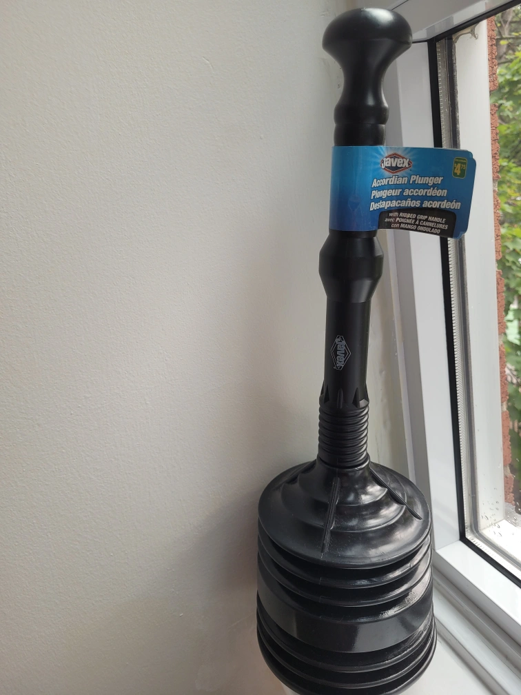 Brand new, NEVER USED, Javex Accordian Plunger. It features a ribbed grip handle for easy use. I purchased two types at Dollarama because I wasn't sure which one was needed. Other one did what it was supposed to do. This plunger appears to be, 'forever a bridesmaid' in my home. it collecting dust here. Again, its never been used.