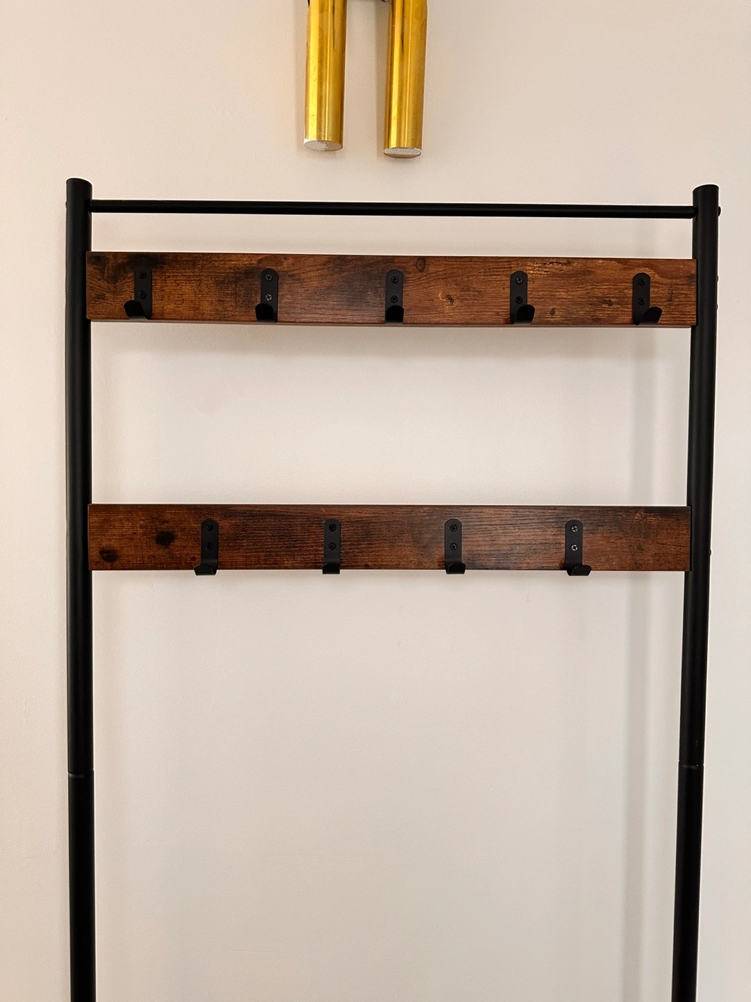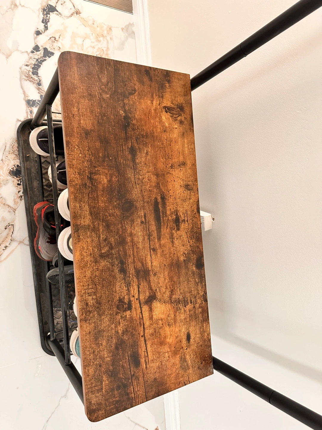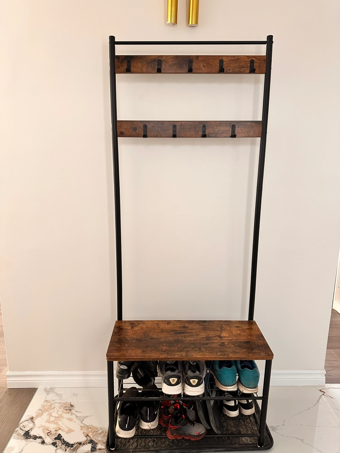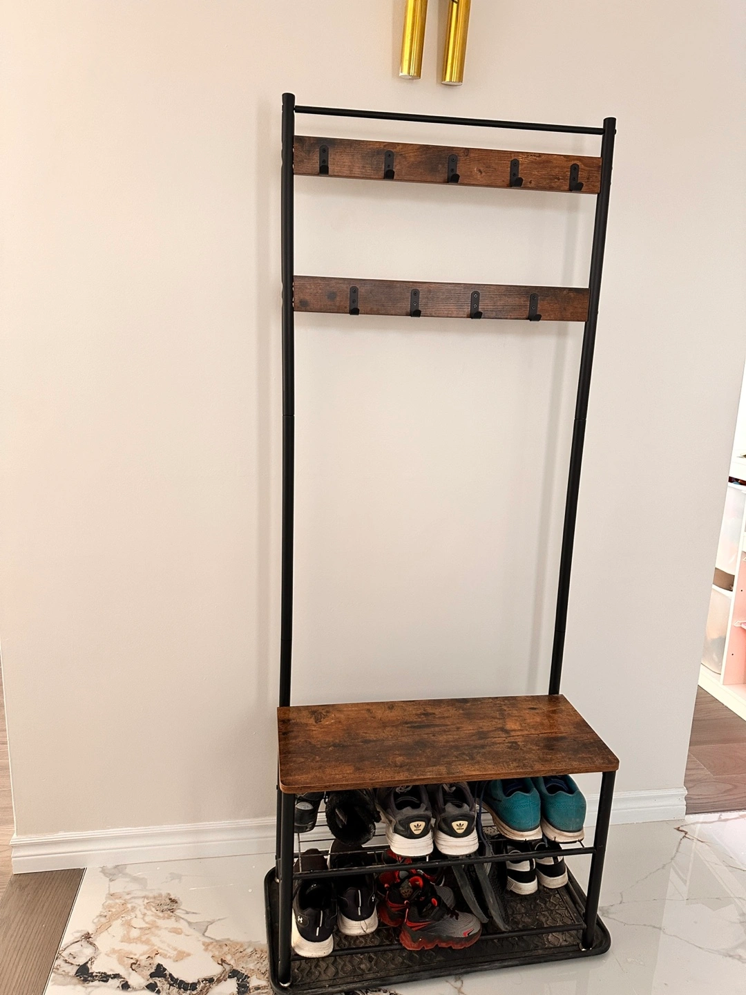 Here's a coat rack with a shoe storage bench! It's perfect for keeping your entryway organized. It features a wooden-look top and two rows of hooks for coats and hats. The bottom shelf provides space for shoes or other items. It's in great condition and ready for a new home!