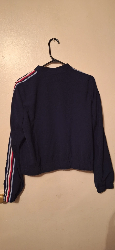 Tommy Hilfiger bomber jacket in navy! It has stripes on the sleeves. Perfect for layering or wearing on its own