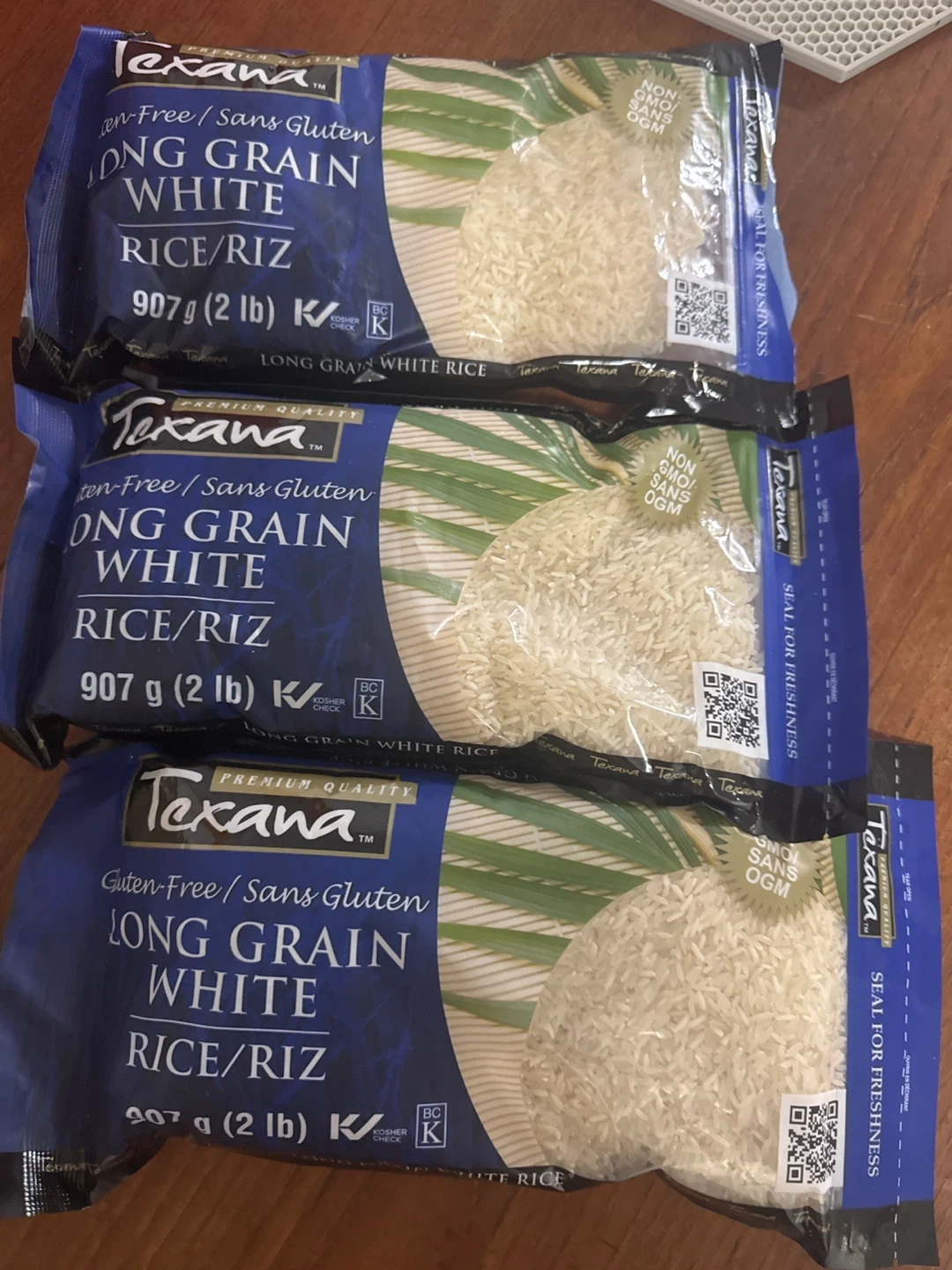 Selling three bags of Texana Long Grain White Rice. Each bag contains 907g (2 lb) of rice. It's gluten-free and non-GMO. Perfect for your next meal! One bag is opened and used once.