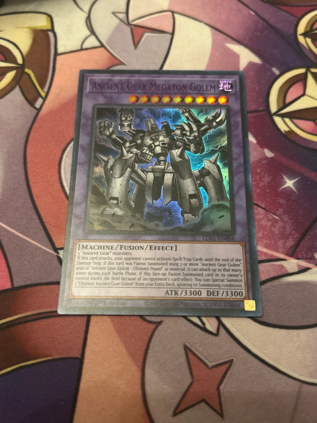 Selling an Ancient Gear Megaton Golem Yu-Gi-Oh! card. It's a Machine/Fusion/Effect monster card with ATK/3300 and DEF/3300. If this card attacks, your opponent cannot activate Spell/Trap Cards until the end of the Damage Step