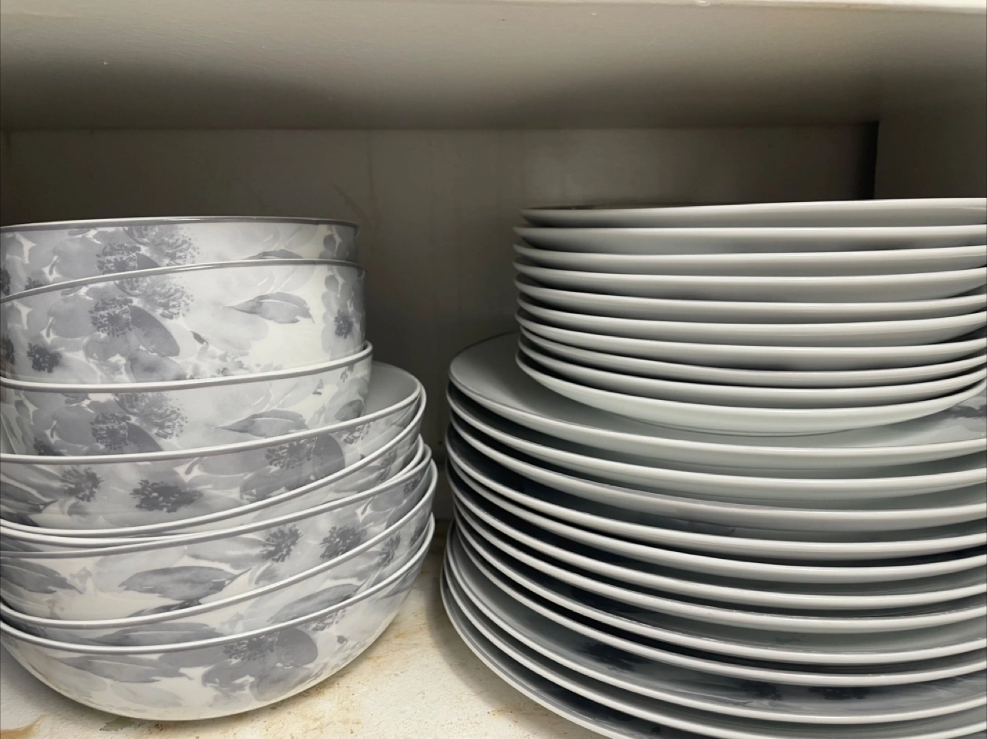 Selling a set of dinnerware including plates and bowls. They feature a lovely floral pattern in shades of grey and white. Perfect for everyday use or special occasions!