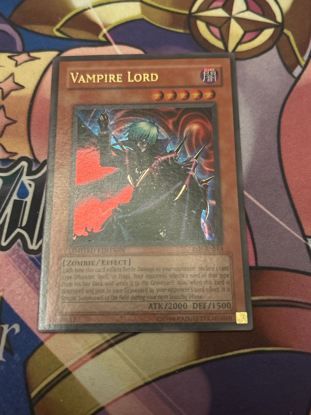 Selling a Yu-Gi-Oh! card, the Vampire Lord, a limited edition card. It's a Zombie/Effect monster with ATK/2000 and DEF/1500. A great addition to any collector's deck!