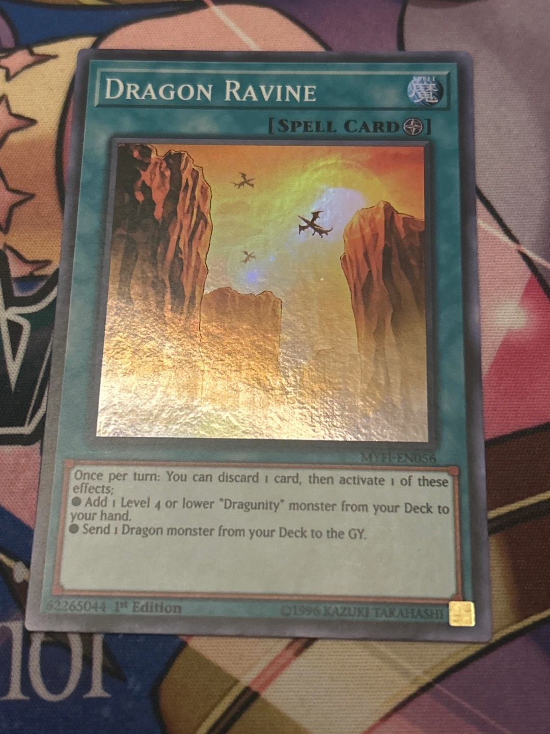 Selling a Dragon Ravine spell card from Yu-Gi-Oh! It's a first edition card. Once per turn, you can discard 1 card, then activate 1 of these effects: Add 1 Level 4 or lower "Dragunity" monster from your Deck to your hand or send 1 Dragon monster from your Deck to the GY