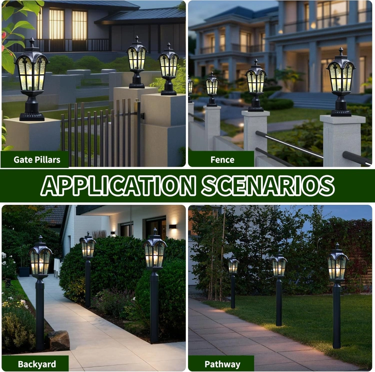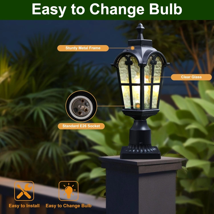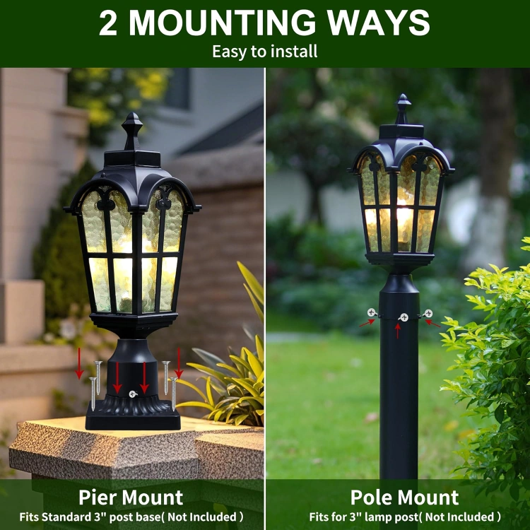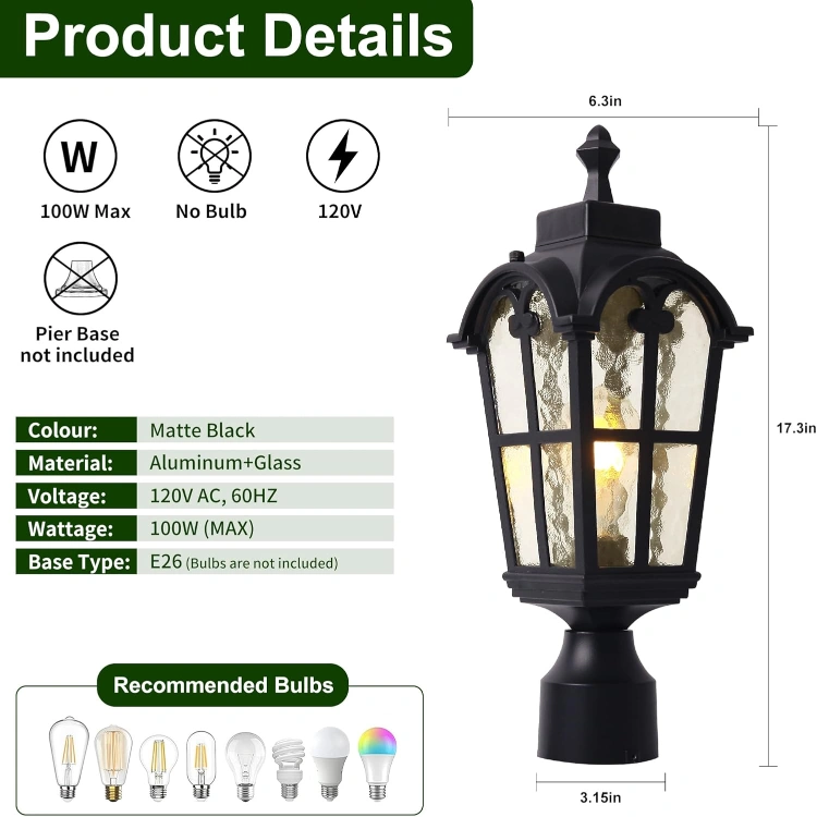 Outdoor Post Lights Fixture Anti-Rust Lamp Post Light Fixture Waterproof Exterior Pole Light Outside Pole Lighting for Yard Pathway Driveway Fence, Brand New in the Box/Sealed Features: 【Outdoor Post Lights Design】:Our black post light fixture are constructed with sturdy metal frame and fortified with explosion-proof tempered glass. Robust design makes these lamp post light long-lasting, IP65 waterproof, shock-resistant and thermally stable,enabling it to withstand any outdoor environment, no worry about strong sun, heavy rain, snowy, icing, storm, etc. Whether it’s rain, snow, extreme high or low temperatures, these outdoor pole light will never rust or corrode after years of use. 【Transparent Toughened Glass】:Different from ordinary glass post light, our outdoor pole lights are fortified with explosion-proof tempered glass, which are unbreakable, steady enough. Clear glass design allows your bulb to emit bright lighting to create a beautiful lighting atmosphere outside your home or inside your room. 【Widely Applications】: The black exterior post fixture features an elegant and classic design that adds a touch of sophistication to any decorative style. The black finish and intricate detailing complement various outdoor decor styles. Fits 3" mounting base (Sold separately) and can also be mounted on a 3" post or pole. Suitable for front door, porch, patio, garden, balcony, backyard, entryway, doorway, foyer, pathway, walkway, driveway, street, etc. This exterior lights for house can create beautiful lighting outside for you. 【Recommended Bulbs】: Various types of bulb with E26 base can be used in this lamp post light fixture , such as LED, flame, RGB, CFL, incandescent and halogen bulb(Bulb not included). The wattage of the bulb you choose shall be under 100W ( MAX 100W). 【Easy To Install】: The glass shade is pre-assembled and all necessary mounting accessories and clear installation instructions are included for quick and easy installation. The top of pole lights outdoor can be opened so you can easily clean the outdoor post lamps and replace the bulb whenever you want without taking it apart.