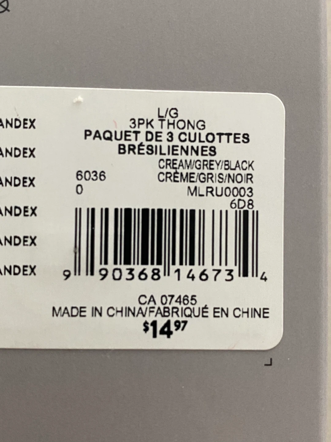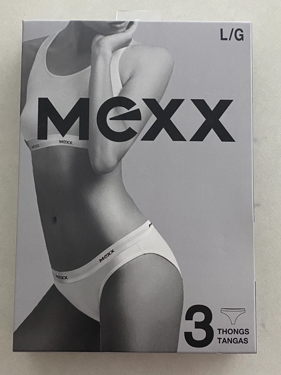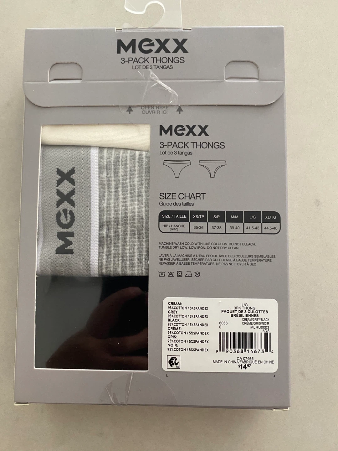 Selling a new pack of MEXX 3-pack thongs in size L/G. The colours are cream, grey, and black. The original price was $14.97. They are made of 95% cotton and 5% spandex.