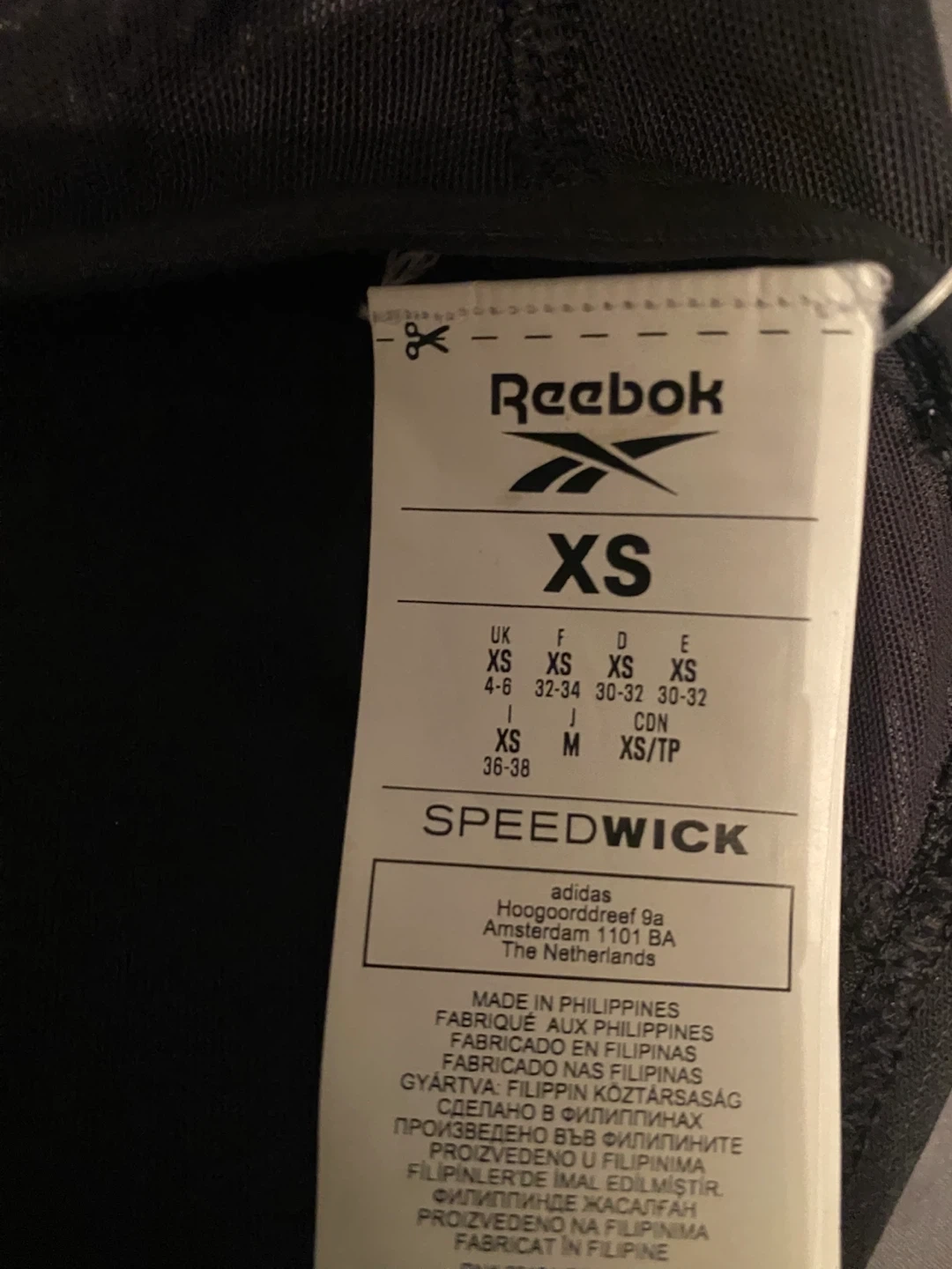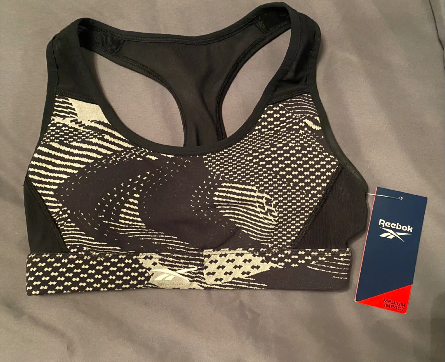 Selling a NEW Reebok sports bra in size XS. It's black with a cool pattern. Features Speedwick technology to keep you dry and comfortable during workouts