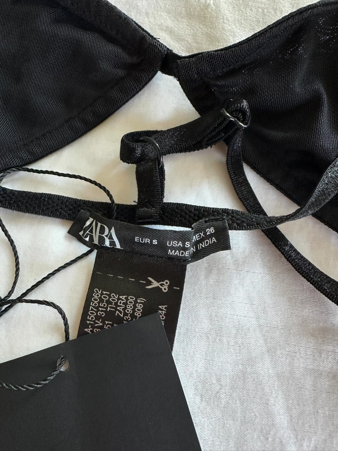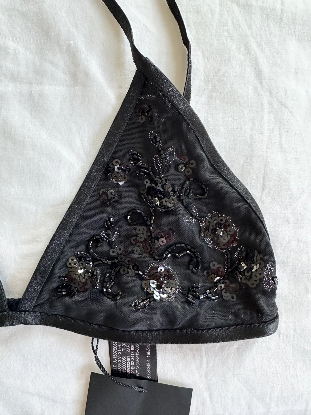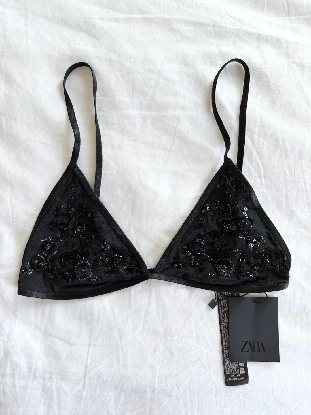 Brand new with tags Zara triangle bralette with adjustable thin straps. Embroidered detail with bead and sequins. Colour: black Size: Small Cash only.