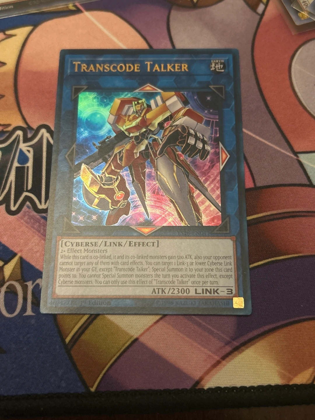 Selling a Transcode Talker Yu-Gi-Oh! card. It's a Cyberse/Link/Effect monster with 2300 ATK and Link-3. When this card is co-linked, it and its co-linked monsters gain 500 ATK, also your opponent cannot target any of them with card effects. You can target 1 Link-3 or lower Cyberse Link Monster in your GY, except "Transcode Talker"; Special Summon it to your zone this card points to. You cannot Special Summon monsters the turn you activate this effect, except Cyberse monsters. You can only use this effect of "Transcode Talker" once per turn