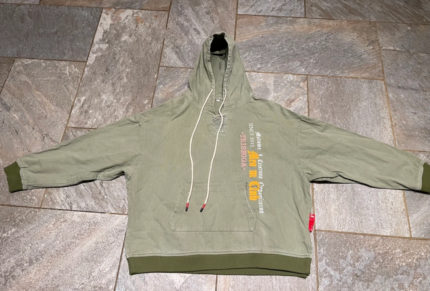 Check out this unique Trisegga hoodie featuring the Meowna Lisa design! It's a size small and has a cool, distressed look. The hoodie is a light green colour and made of a soft material. Perfect for cat lovers and art enthusiasts alike!