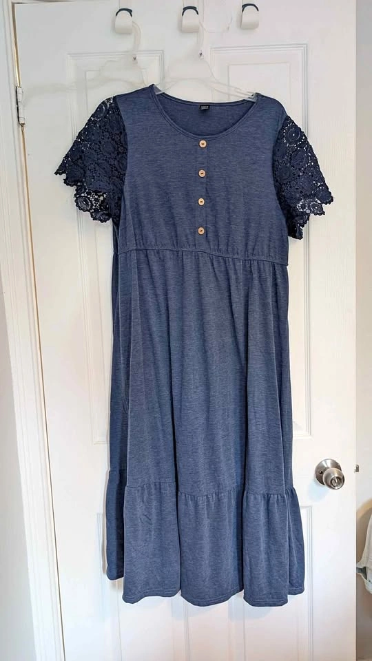 Set of 2 dresses, take both for $5. Blue dress with crochet sleeves, size large. Grey oversized T-shirt dress, size large. EUC. SFH. Pickup only St Clair Ave East and O'Connor.