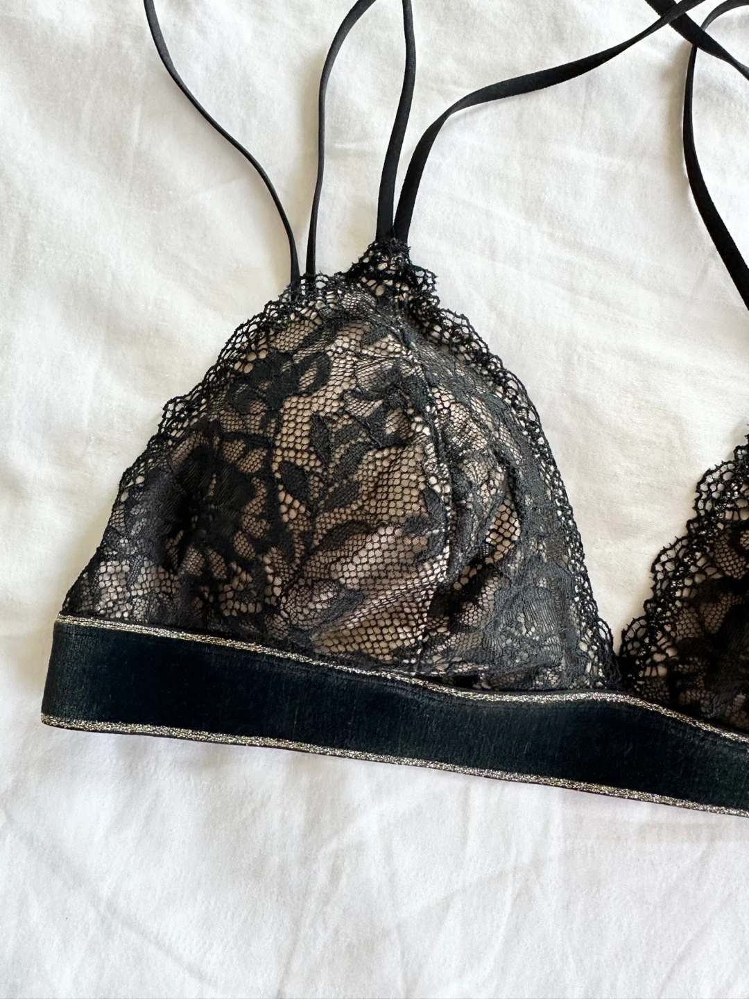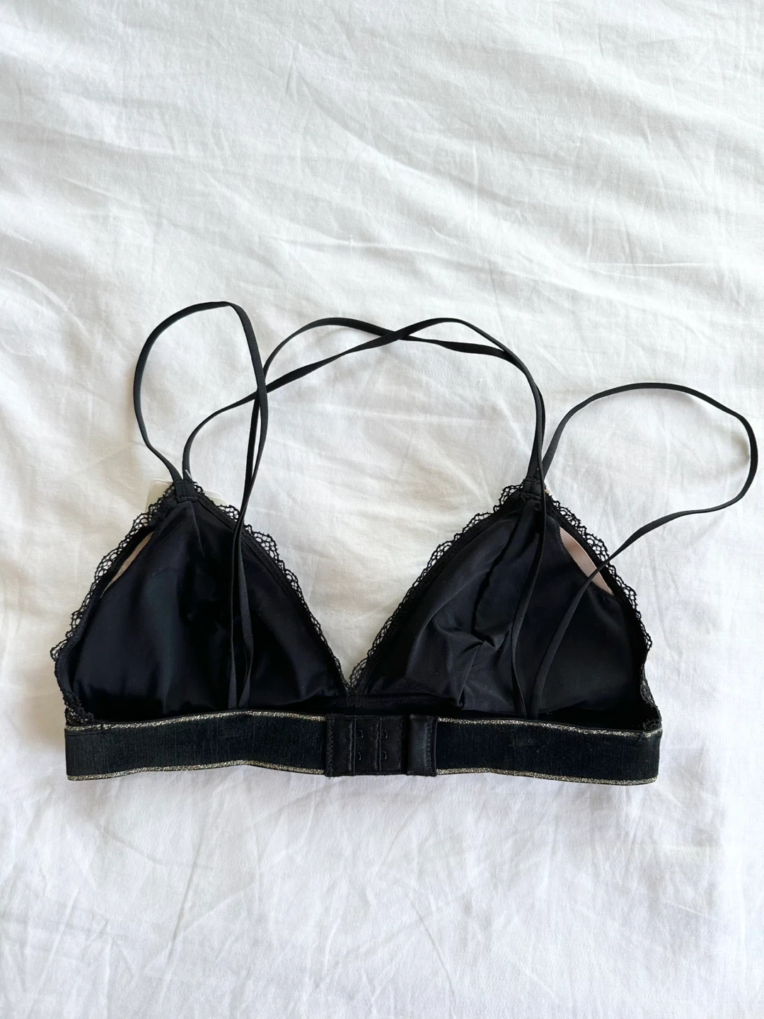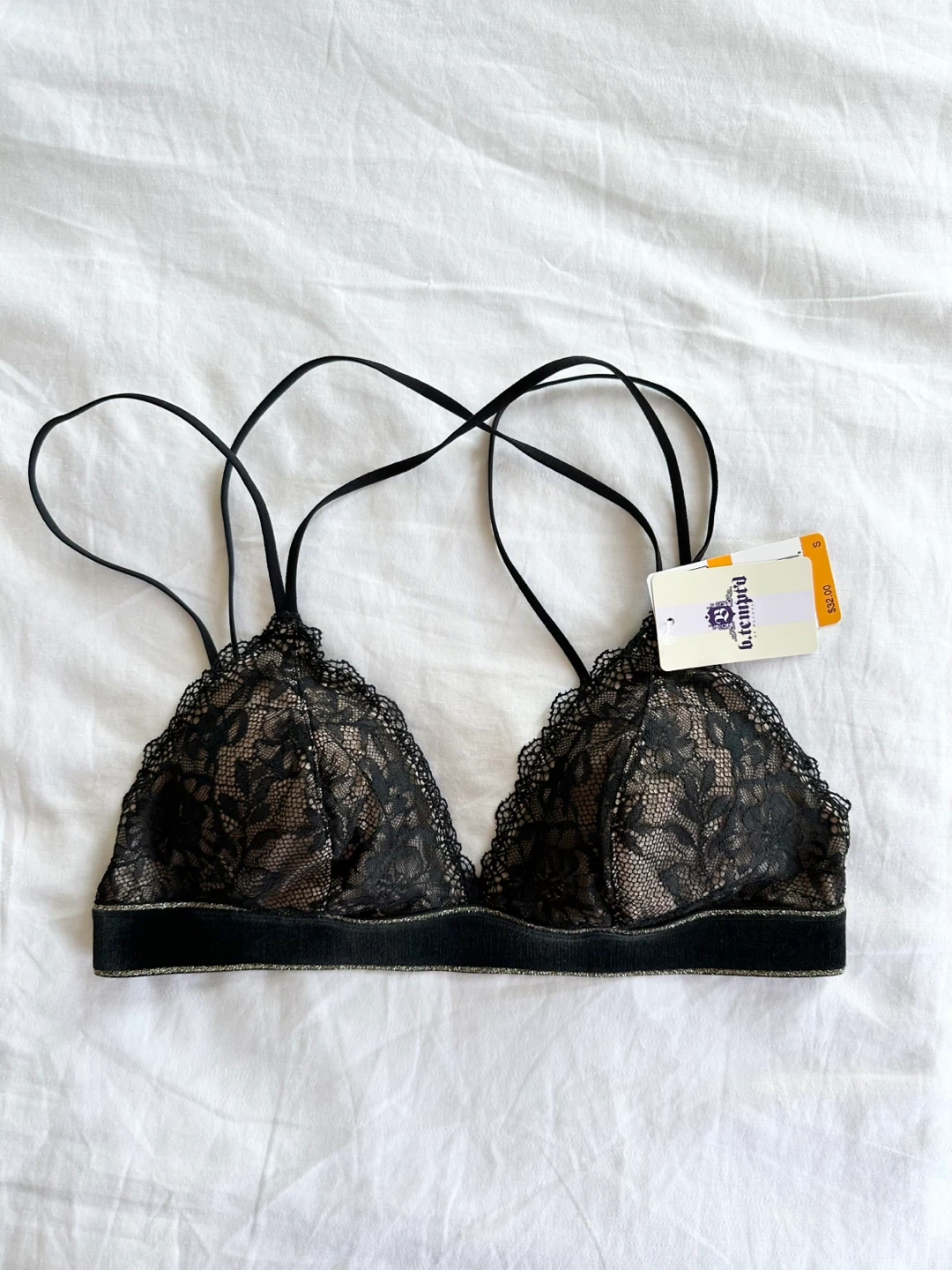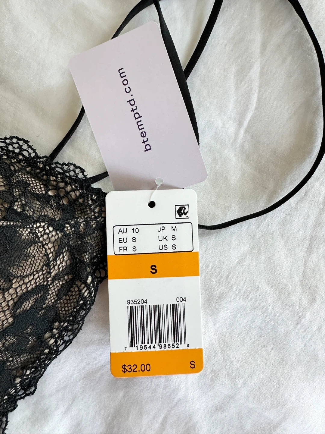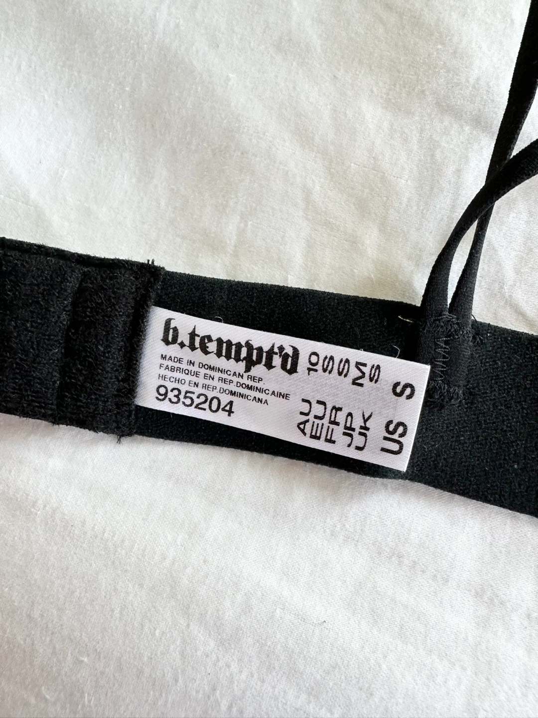 Brand new with tags b.tempt'd black lace bra in size small. Thin straps crossed at the back, removable cups. Cash only.