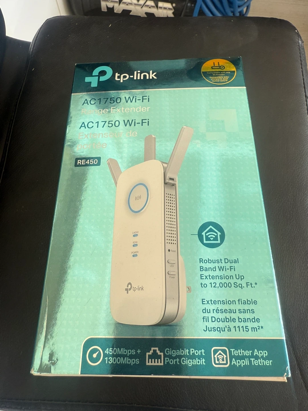 Selling a TP-Link AC1750 Wi-Fi Range Extender, model RE450. It boosts your Wi-Fi signal to cover up to 12,000 sq ft. It supports both 2.4GHz and 5GHz bands and offers speeds of 450Mbps + 1300Mbps. It also has a Gigabit Port and Tether App compatibility.