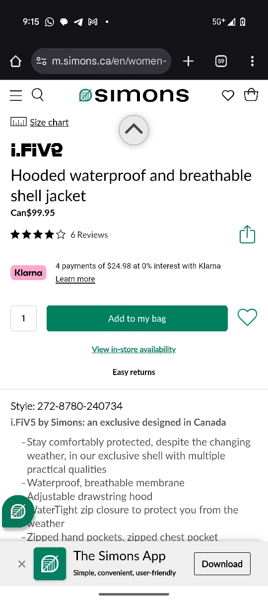 This i.FIV5 hooded shell jacket is designed in Canada, exclusively for Simons. It's waterproof and breathable, perfect for changing weather! - WaterTight zip closure to protect you from the weather - Adjustable drawstring hood - Zipped hand pockets and chest pocket - Originally bought for $90 2 years ago