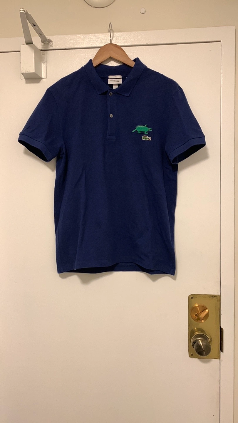 This is a Lacoste x Jeremyville polo shirt in size medium. It's a unisex design and features a unique graphic. Made in Turkey, it's in great condition and ready for a new home!