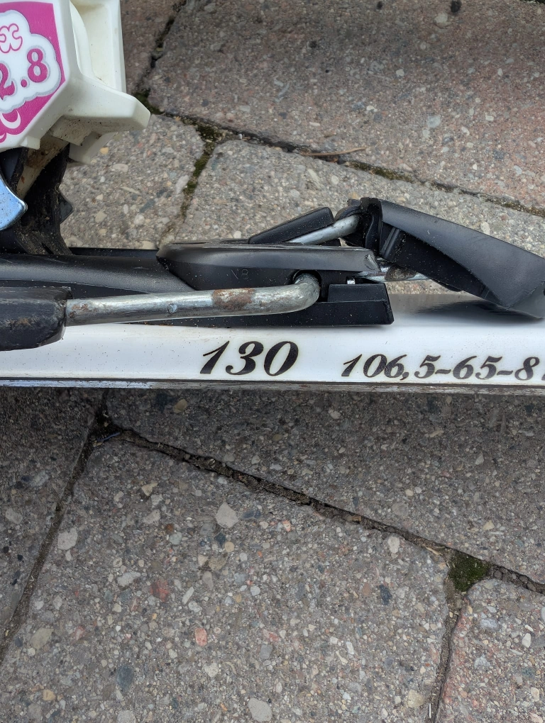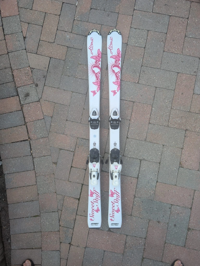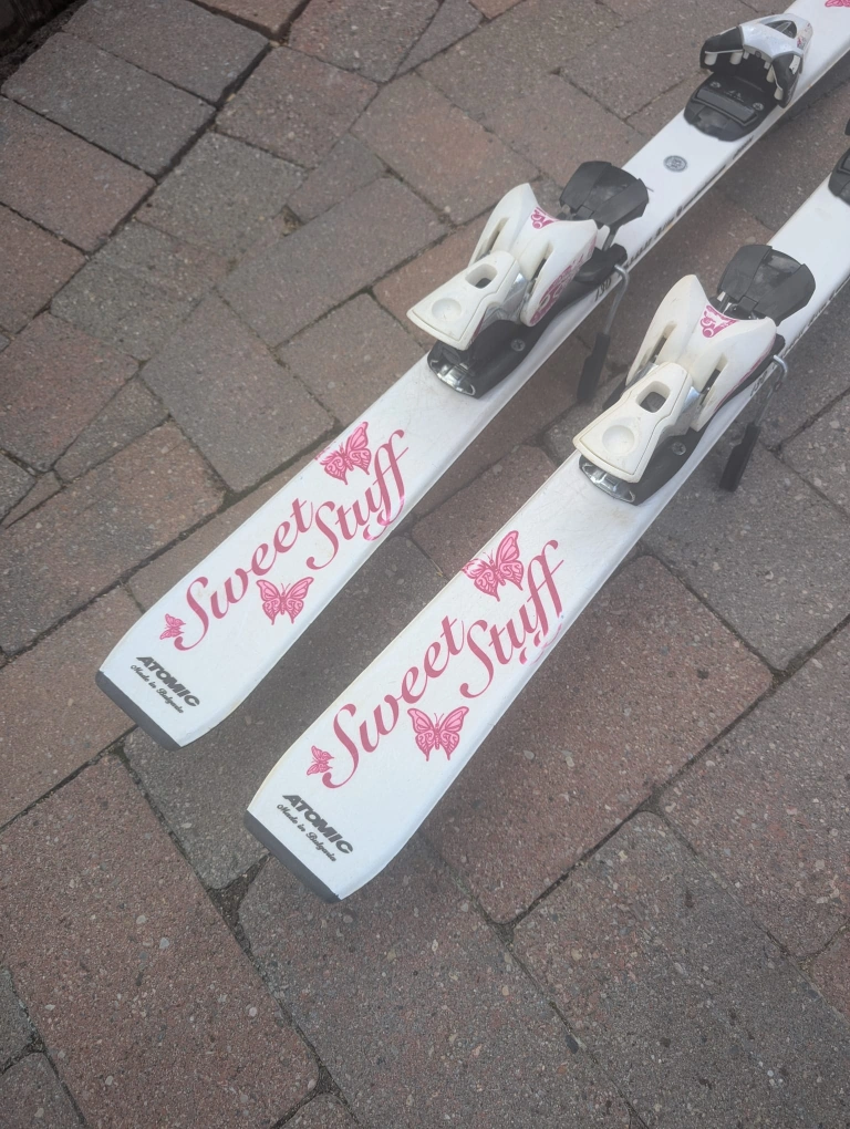 Selling a pair of Atocszllmic Sweet Stuff skis in size 130. They're in good condition and ready for the slopes! They feature a cute design with butterflies and the words 'Sweet Stuff'.