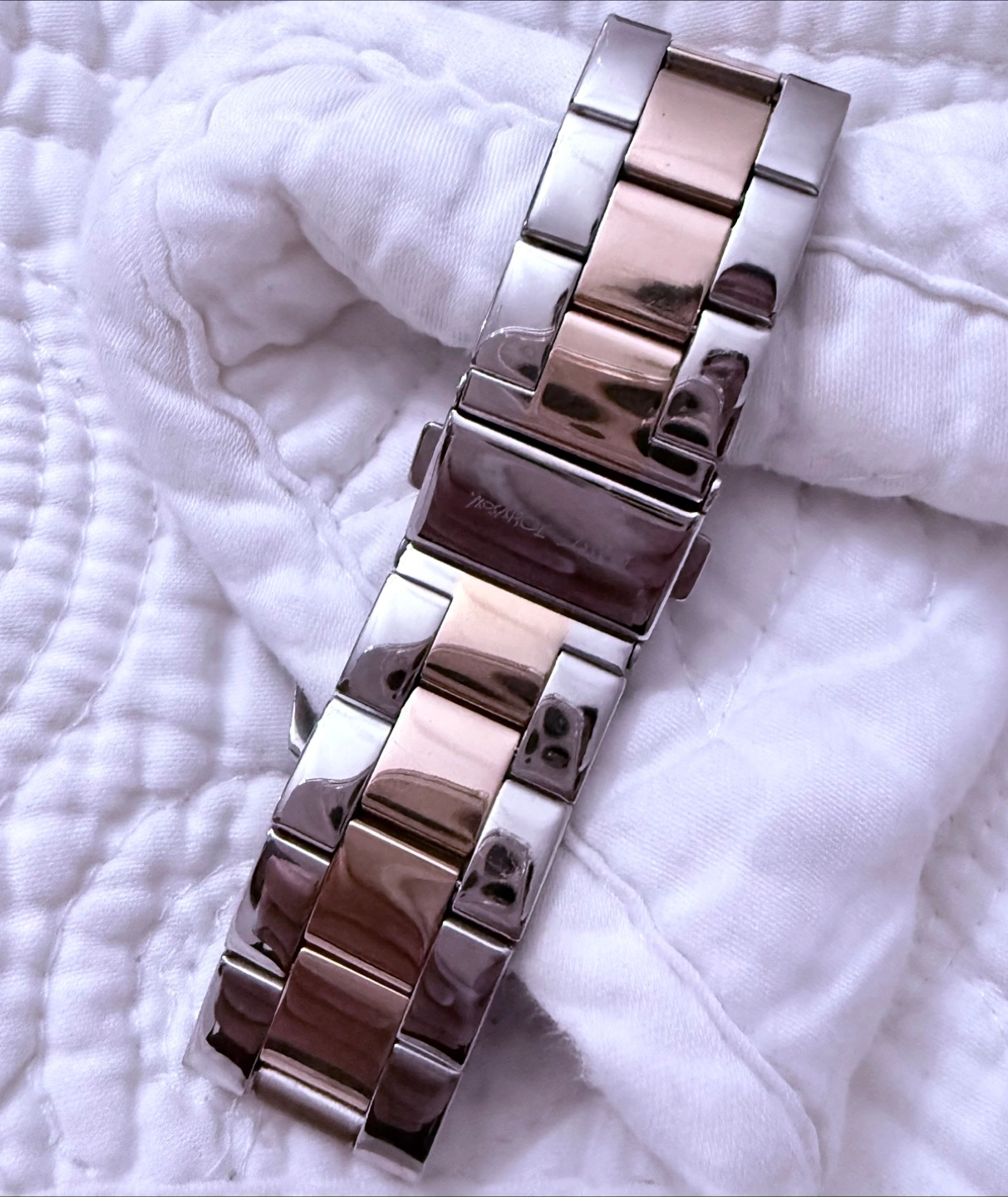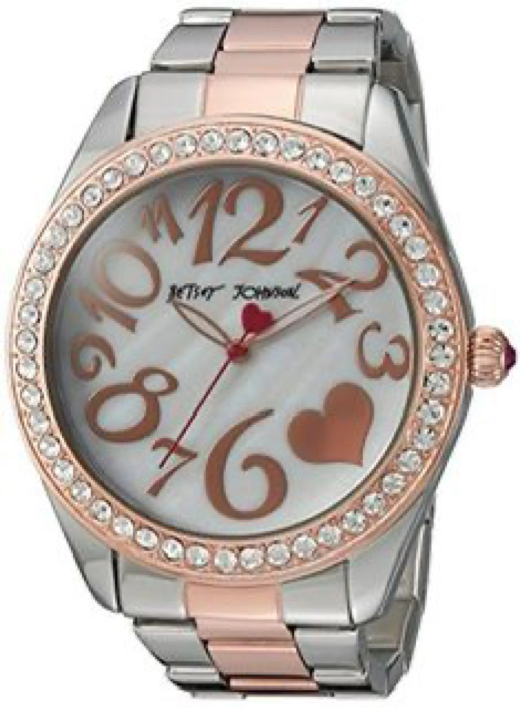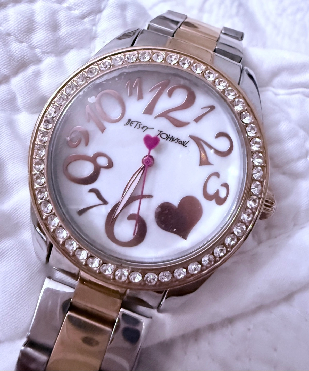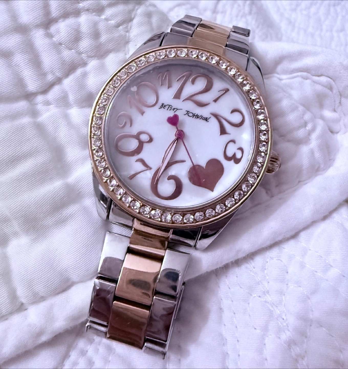 Selling a lovely Betsey Johnson women's watch! It features a unique design with large, whimsical numbers and a heart accent. The two-tone band adds a touch of elegance, and the crystal accents around the face give it a bit of sparkle. It's in great condition and ready to add some fun to your wrist!