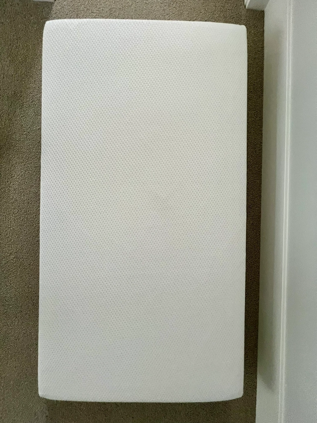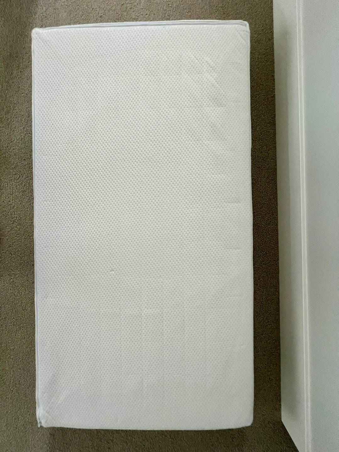 Crib mattress with waterproof cover (full cover with zipper on side). Always had mattress protector on it. No stains. Smoke free/pet free home.