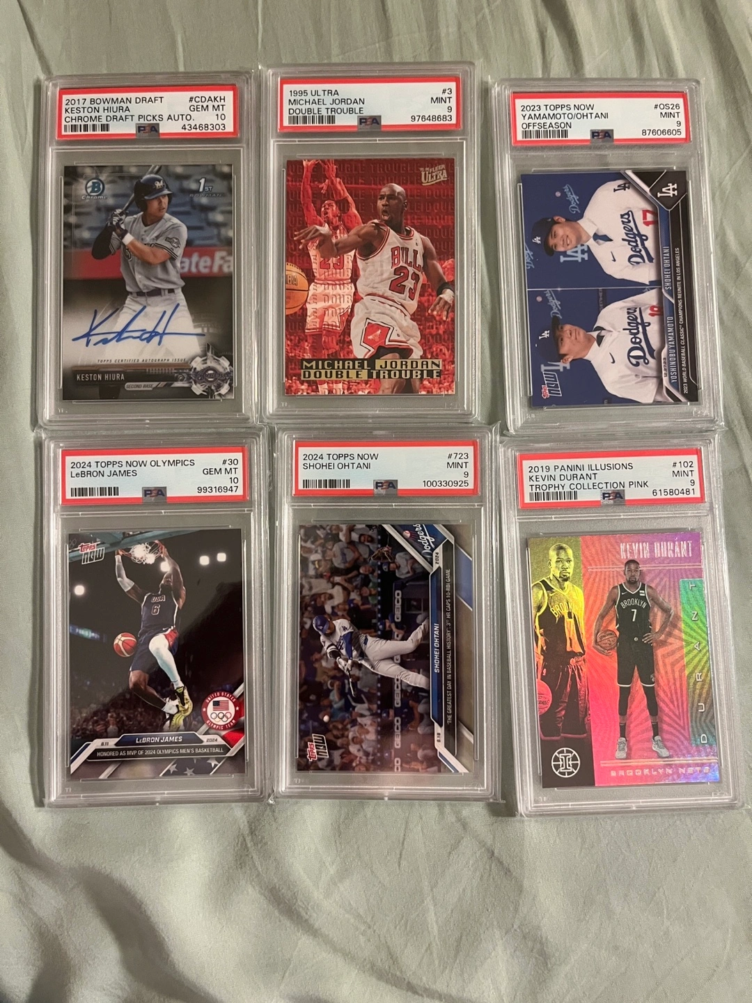 Keston hiura 40$ Sold Jordan 160$ Ohtani/yamamoto 65$ Sold LeBron 50$ Ohtani 50$ Sold Kevin Durant 55$ Sold Luis Rodriguez 50$ Sold Trent Palmer 40$Sold Mike trout 55$ If you’re budget is below 40$ for 1 card don’t message me I’m giving discounts right now make sure to message me to buy I can only meet up in Kitsilano