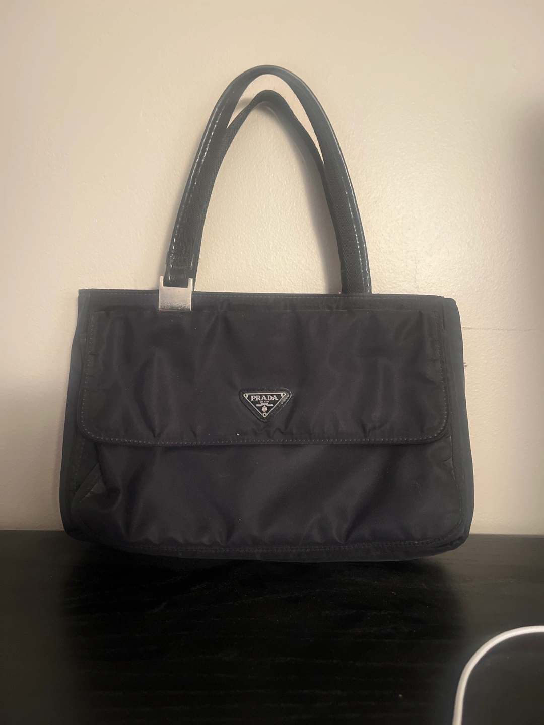 Selling a classic black Prada handbag. It's in great condition and perfect for everyday use. The nylon material is durable and easy to clean. A stylish addition to any wardrobe!