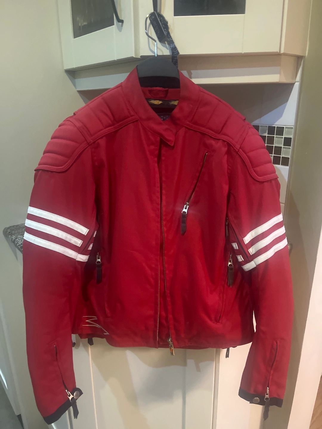 This is a red motorcycle jacket in good condition. It has white stripes on the arms and zipper pockets. Perfect for riding!