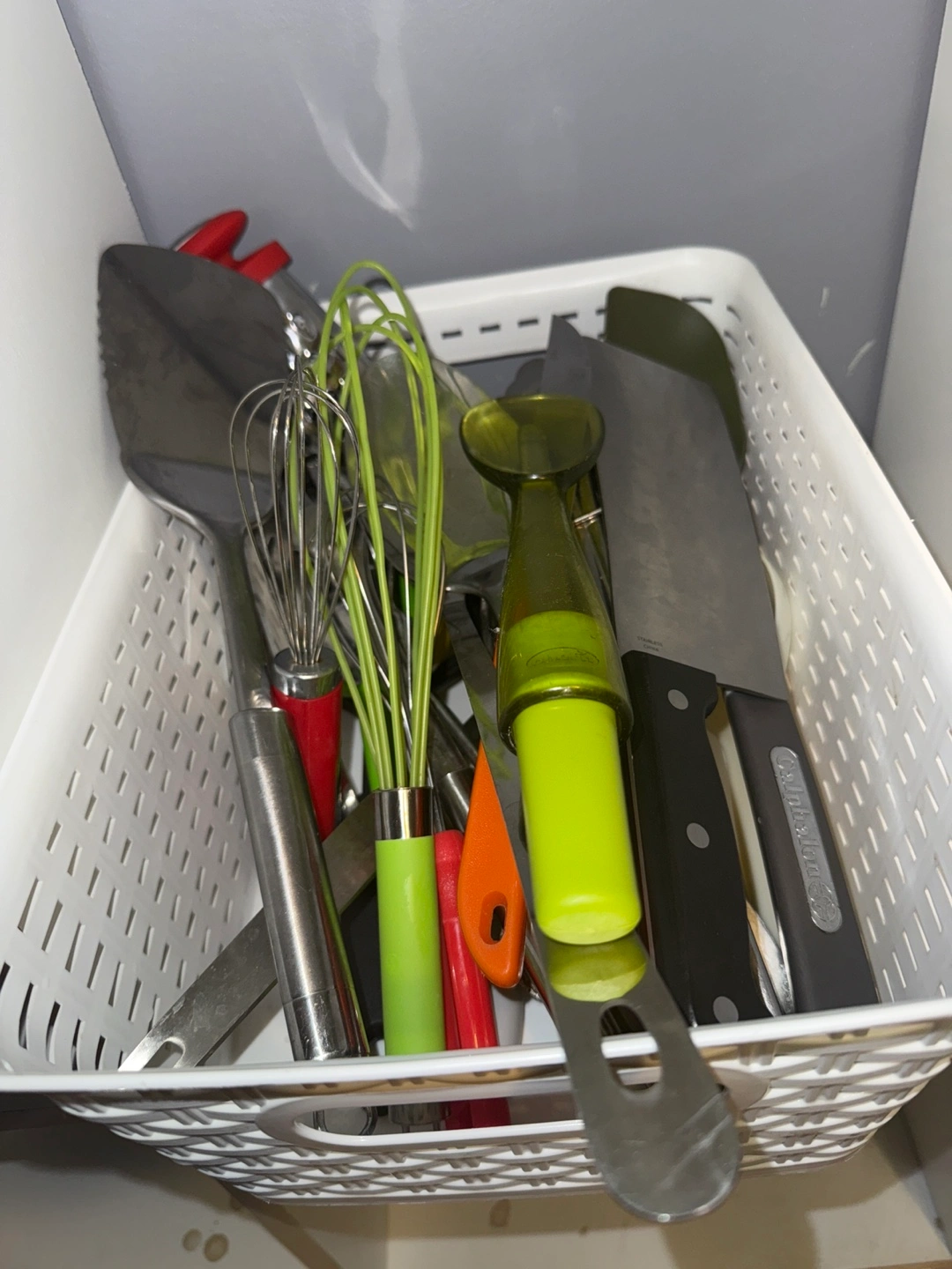 A collection of kitchen utensils stored in a white plastic basket. Includes spatulas, whisks, and knives. Perfect for someone setting up a new kitchen or looking to expand their current collection