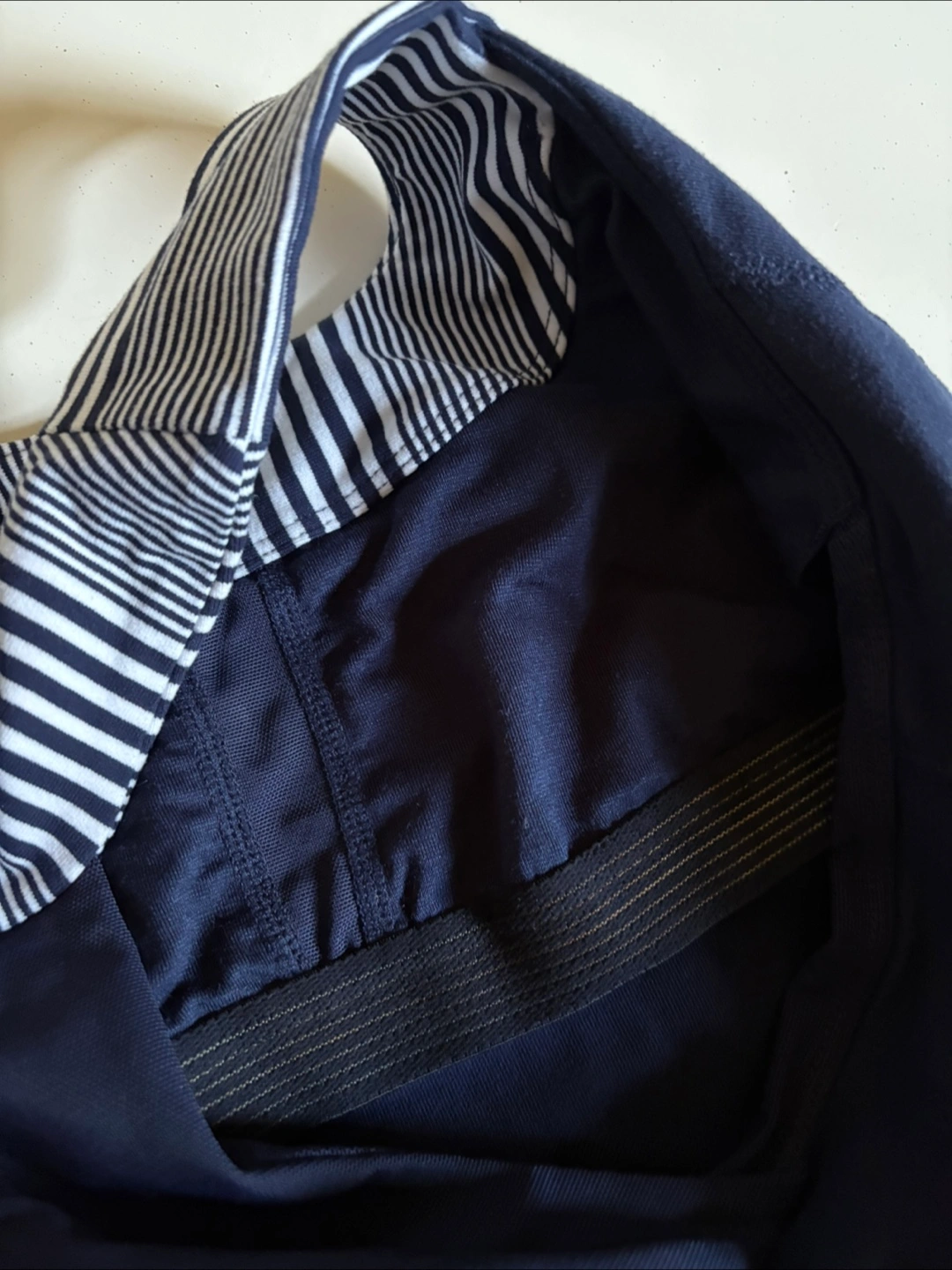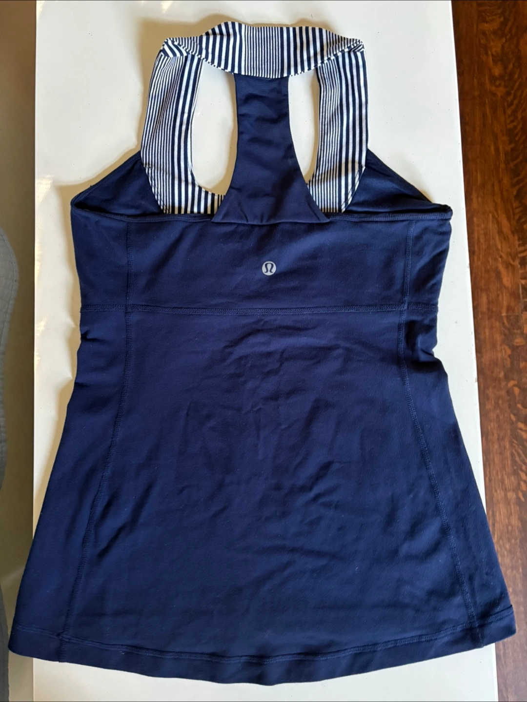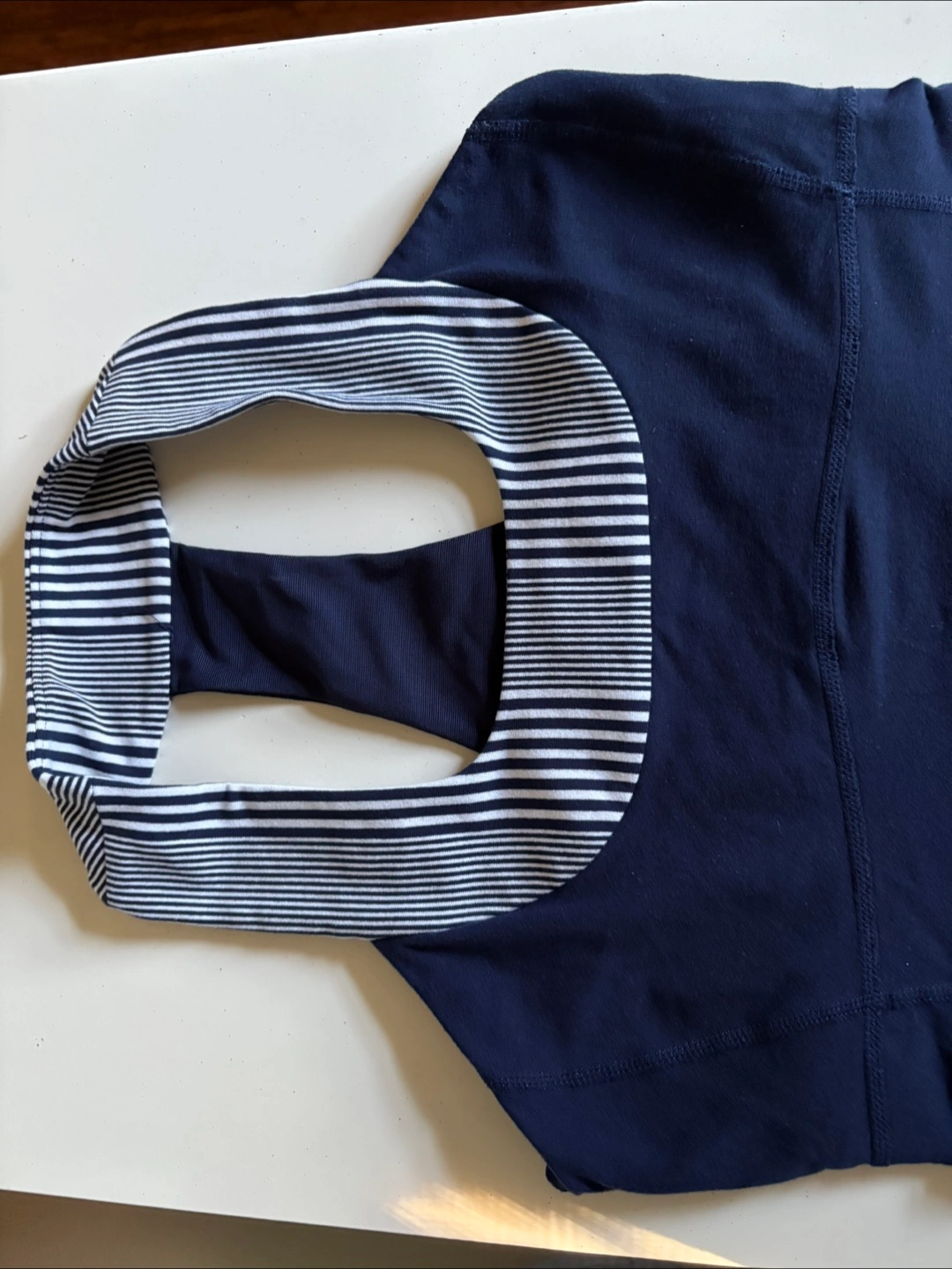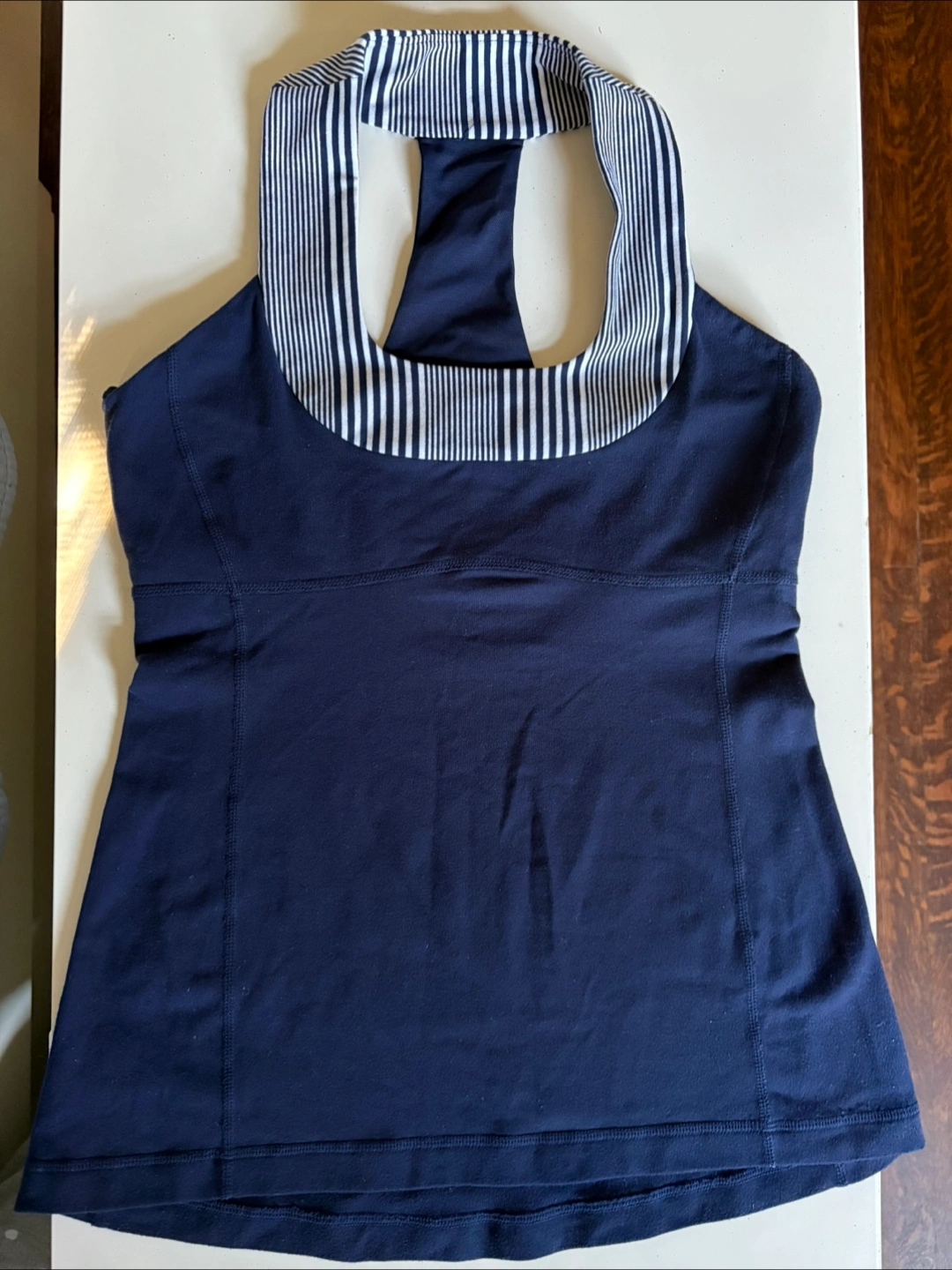 Stylish navy blue halter top with chic striped detailing. Comfortable for yoga and eye-catching. Great condition. I also offer matching yoga pants