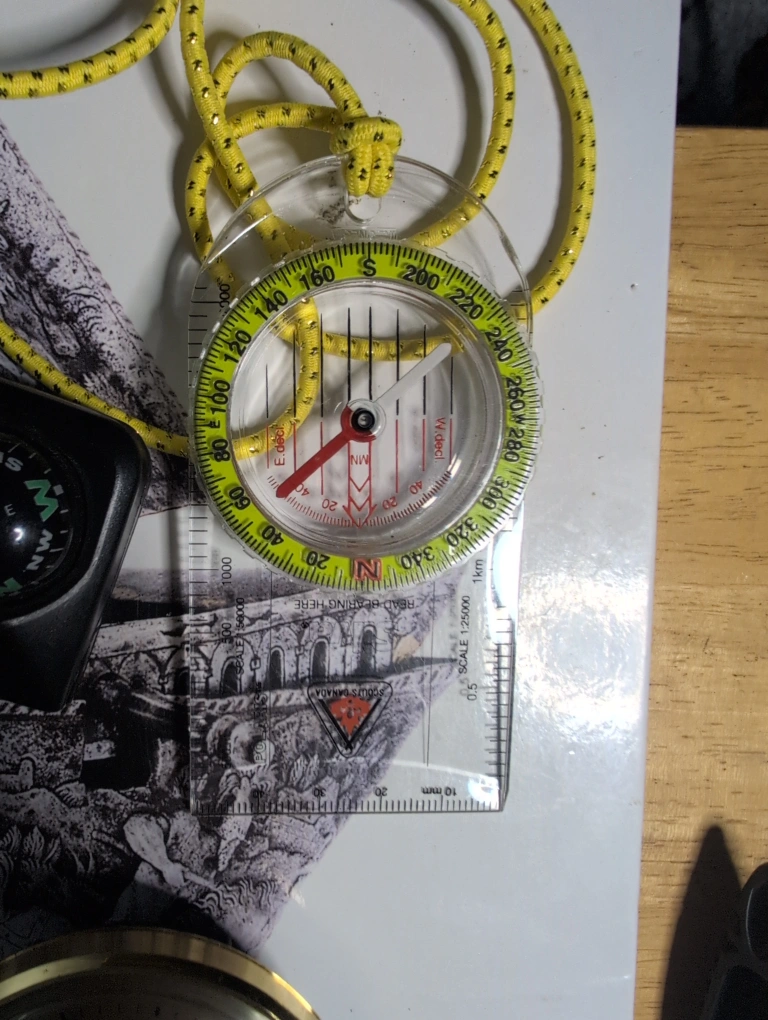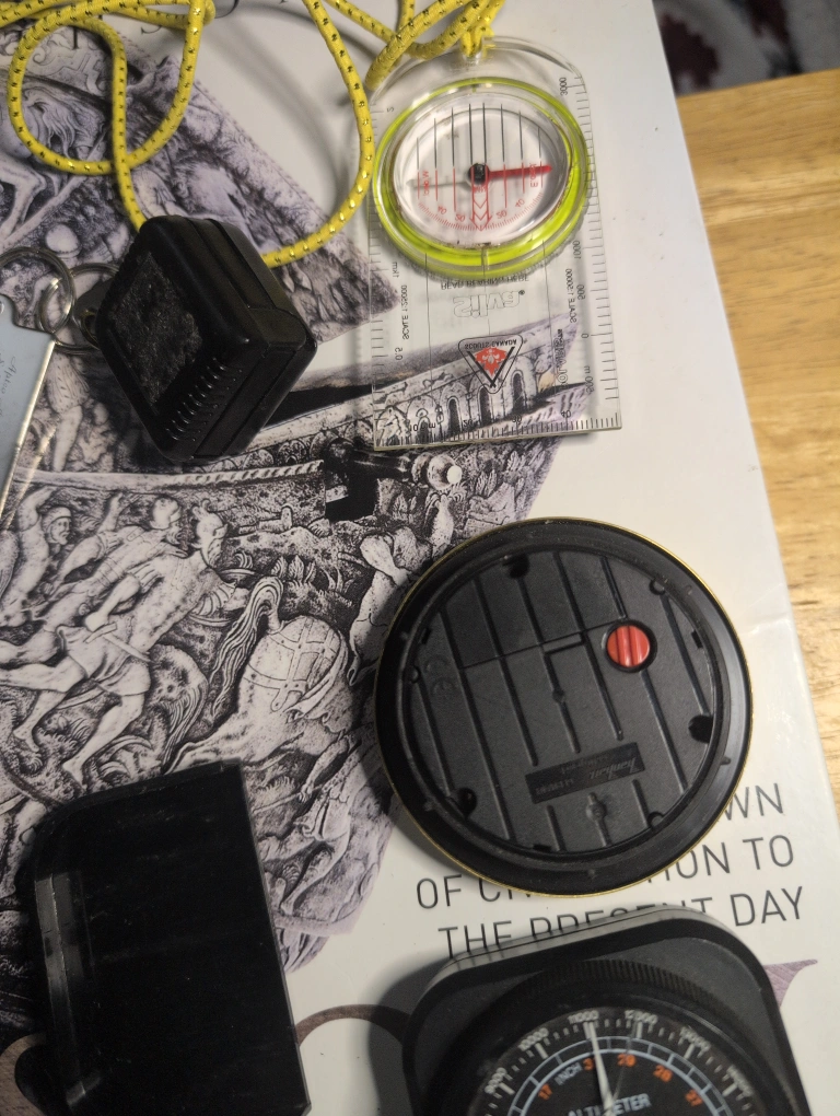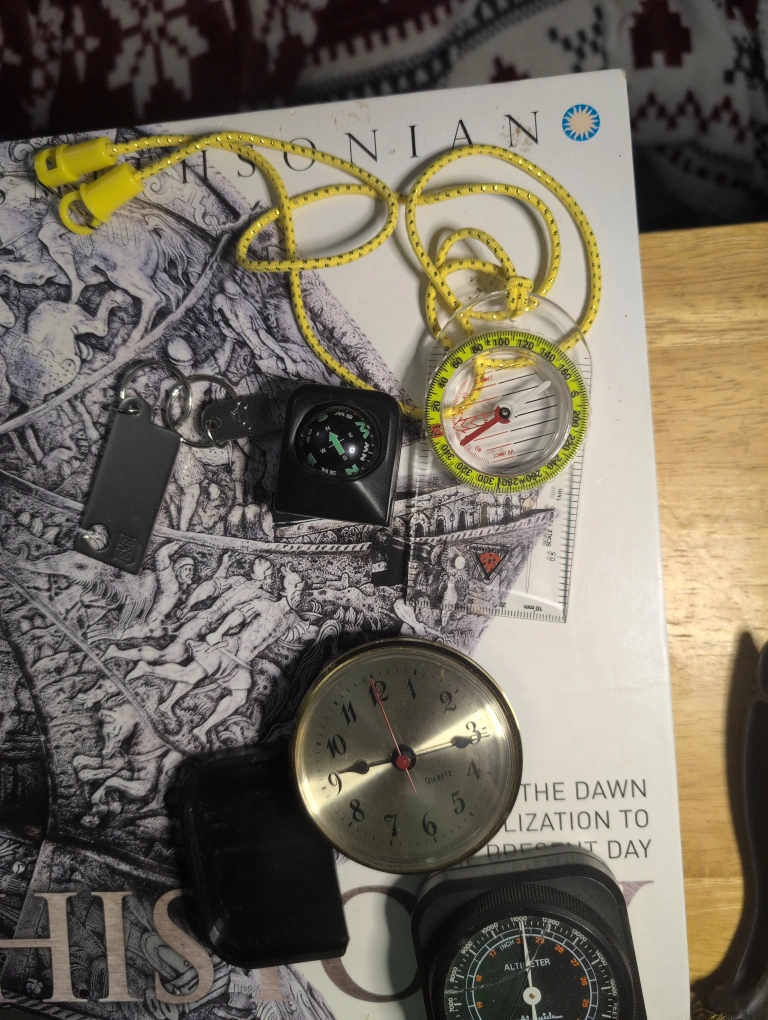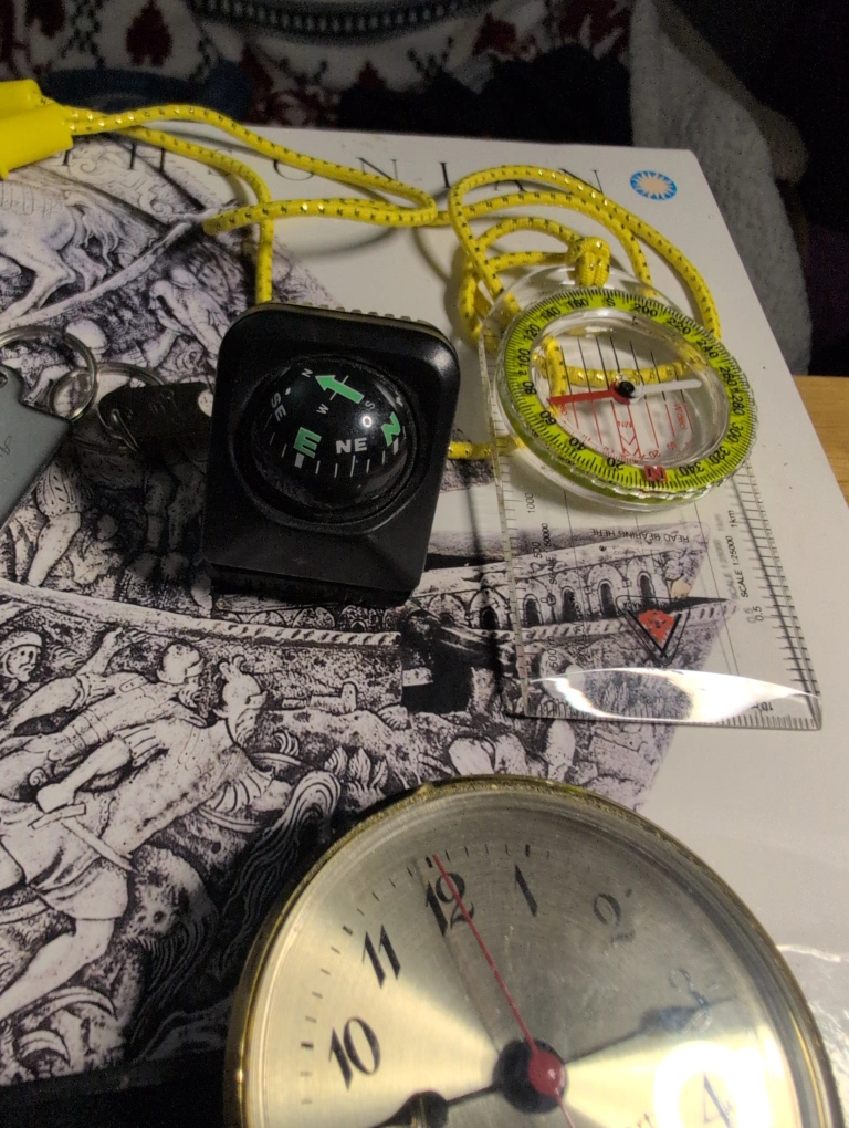 I have a few compasses for sale! They are perfect for hiking, camping, or orienteering. They are in great condition and ready for your next adventure! Includes a compass with a lanyard and a black compass.
