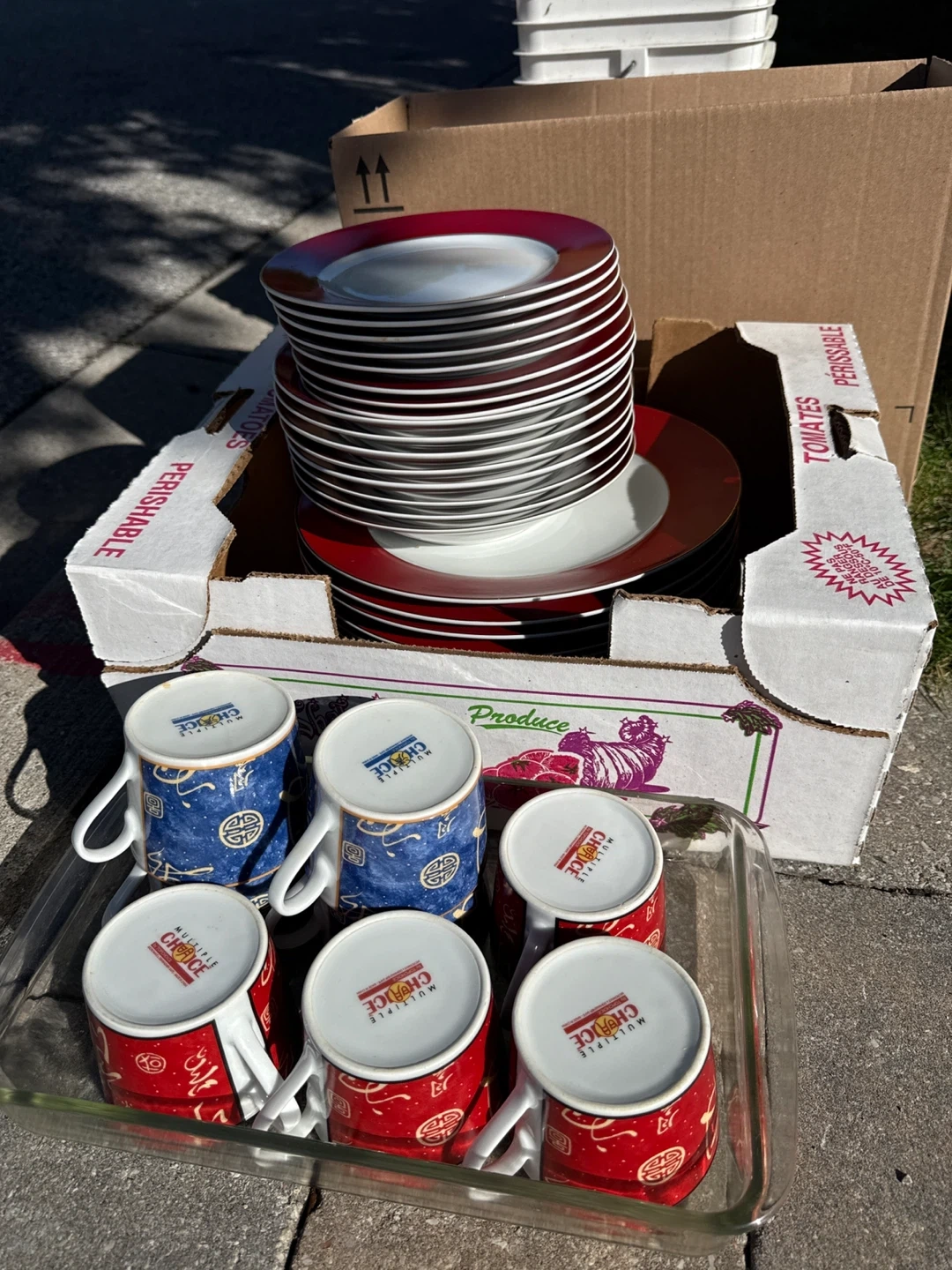 Selling a set of Multiple Choice mugs and plates. The mugs come in red and blue, and the plates are red-rimmed. They are in good condition and ready for a new home! Pick up anytime on curb side.